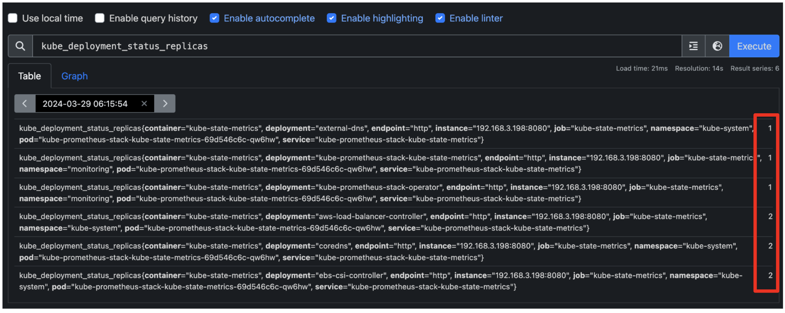 kube_deployment_status_replicas 쿼리를 입력 후 실행하면 오른쪽에 replicas들의 숫자들이 출력됩니다.