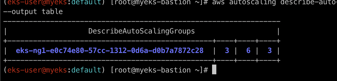 --query "AutoScalingGroups[? Tags[? (Key=='eks:cluster-name') && Value=='myeks']].[AutoScalingGroupName, MinSize, MaxSize,DesiredCapacity]" \