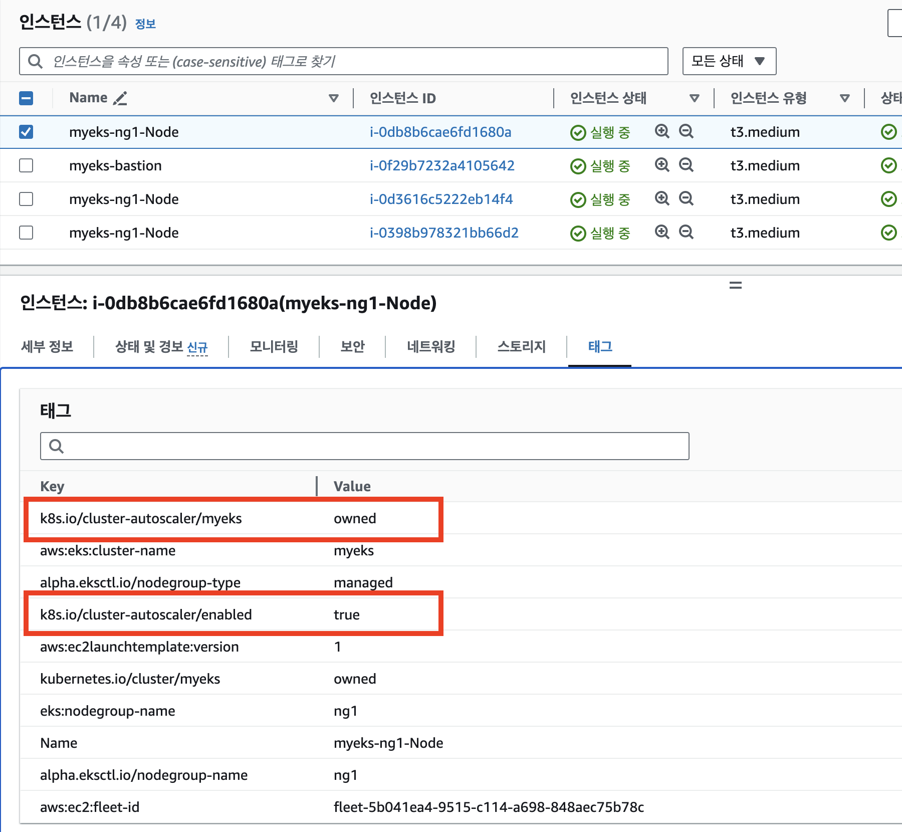 또한 AWS Managed Console에서 EC2 메뉴에 접근하신 후 Worker Node Instance의 tag에서도 같은 값을 확인하실 수 있습니다.