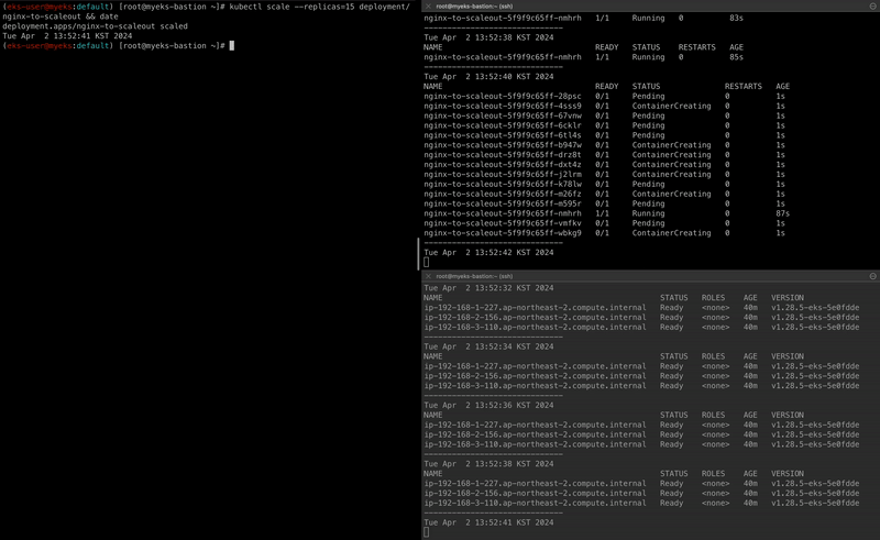 자세히 살펴보자면 scale-out을 통해 Pod의 replicas를 15개로 늘리면서 node의 리소스 요청량이 많아졌고, ASG를 통해 Worker Node의 수를 늘려 해당 Pod가 모두 배포됩니다.