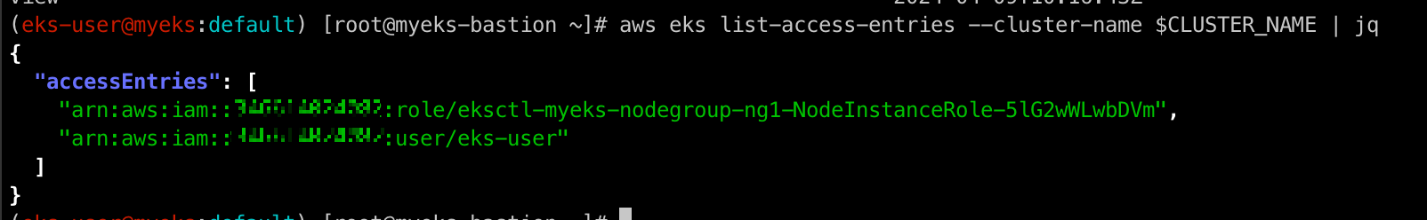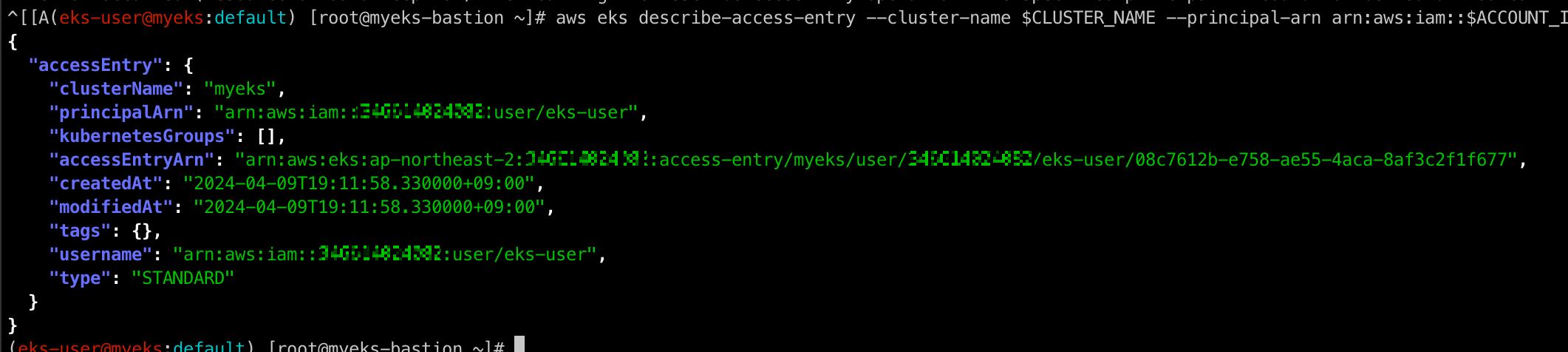 aws eks describe-access-entry --cluster-name $CLUSTER_NAME --principal-arn arn:aws:iam::$ACCOUNT_ID:user/eks-user | jq