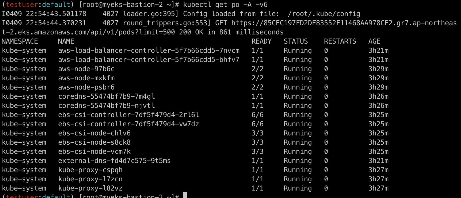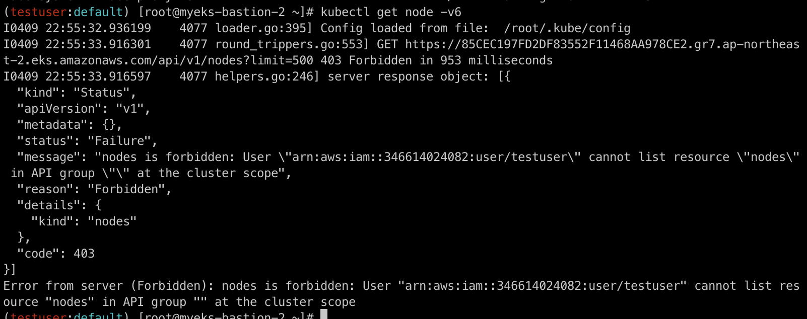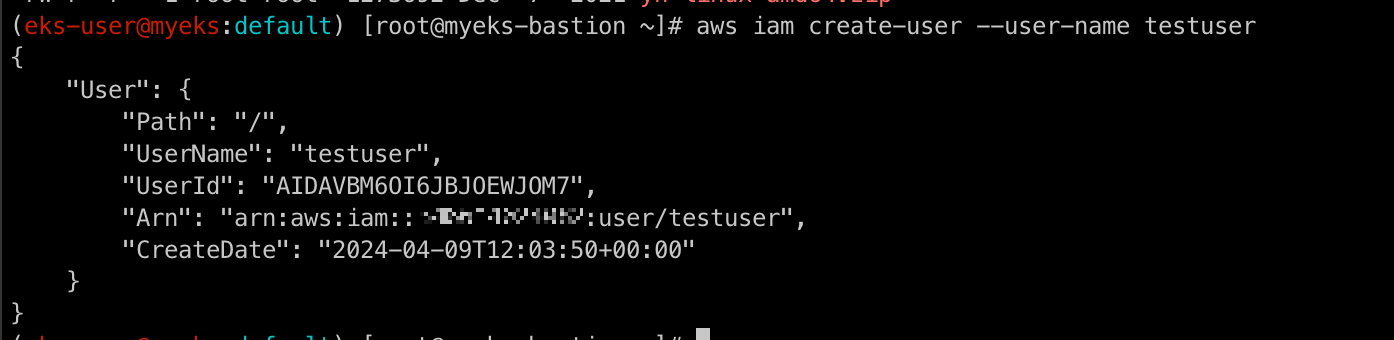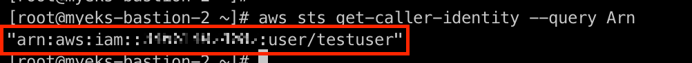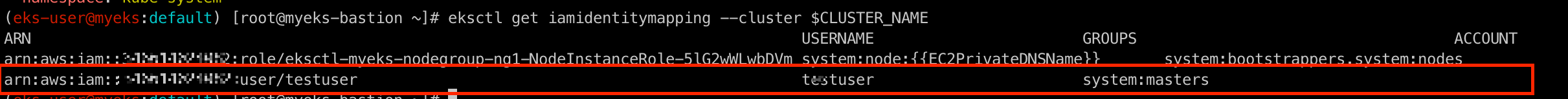 eksctl create iamidentitymapping --cluster $CLUSTER_NAME --username testuser --group system:masters --arn arn:aws:iam::$ACCOUNT_ID:user/testuser