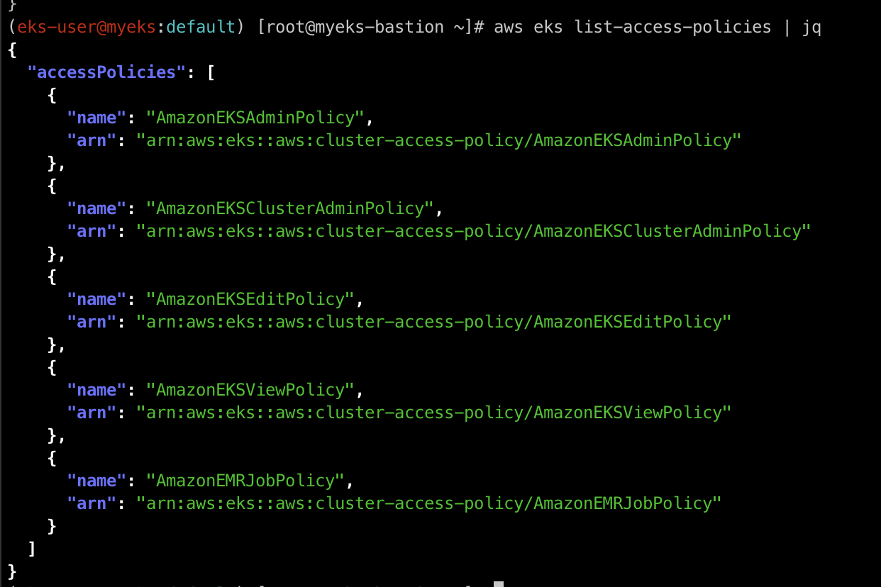 aws eks list-associated-access-policies --cluster-name $CLUSTER_NAME --principal-arn arn:aws:iam::$ACCOUNT_ID:user/eks-user | jq