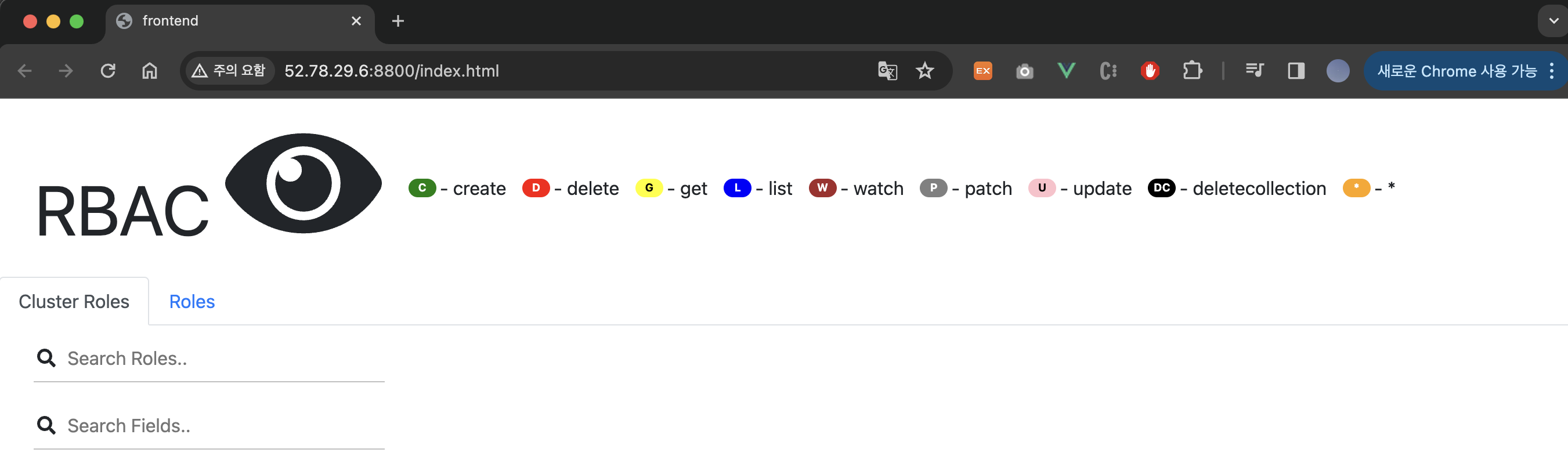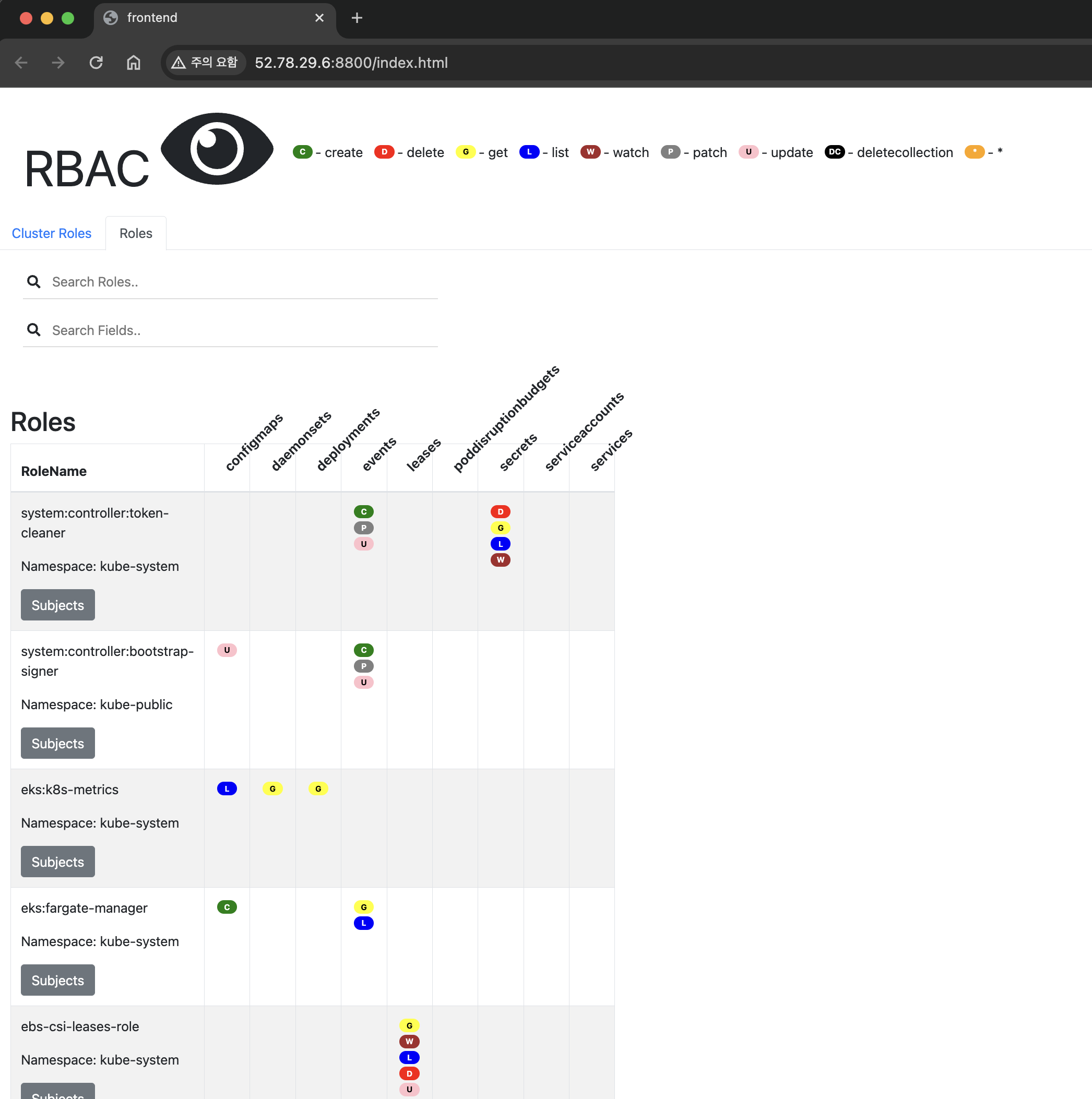그러면 위의 사진과 같이 ClusterRole과 Role등 RBAC를 한눈에 볼 수 있는 page가 띄어지게 되는데 port 노출 후 바로 보시게 되면 아무런 데이터가 없습니다. (데이터를 수집하는 2~3분 소요)