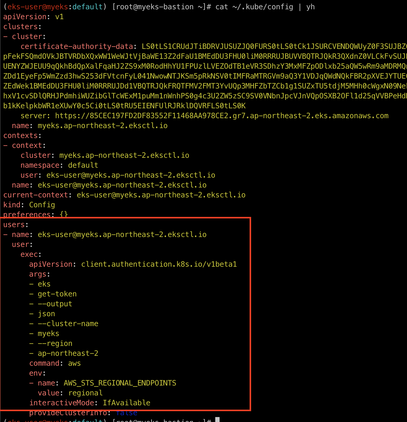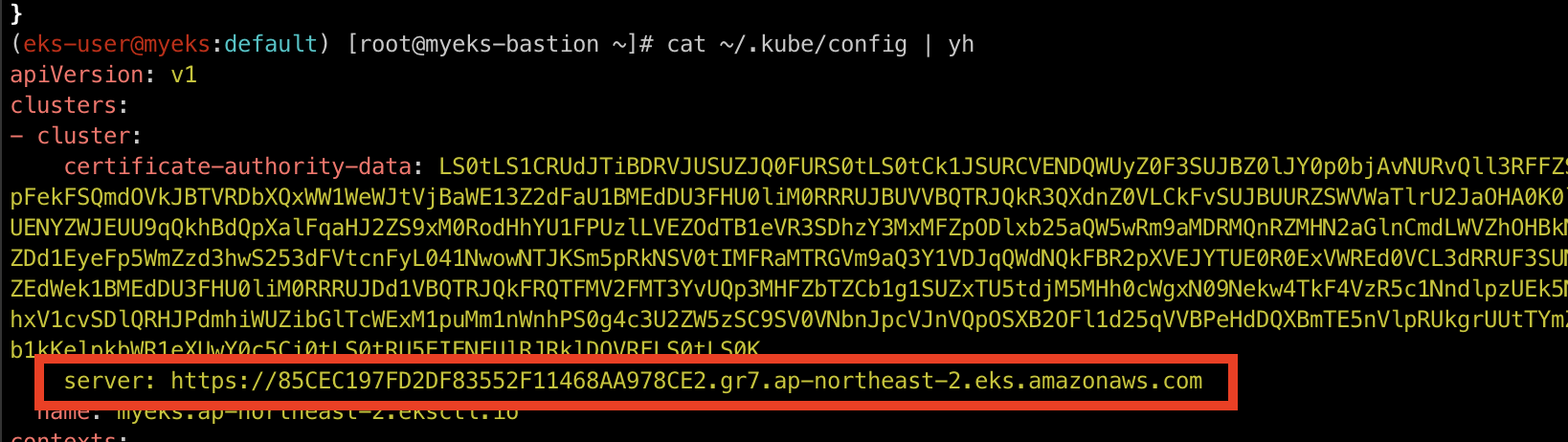 EKS API Cluster Endpoint는 위에서 살펴본 config 파일안에 명시되어 있습니다.