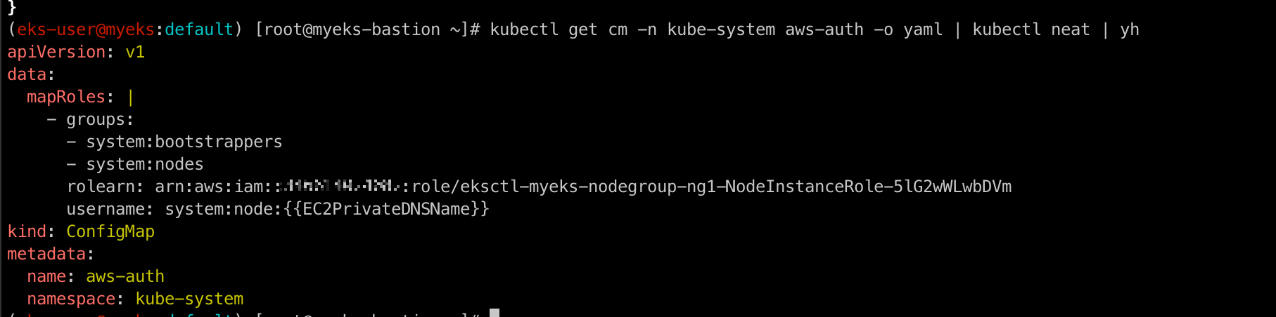 kubectl get cm -n kube-system aws-auth -o yaml | kubectl neat | yh