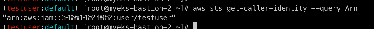 그 후 위의 명령어를 통해 configmap에 설정된 aws-auth 정보를 확인하여 system:masters가 testuser에 부여된 것을 확인합니다.