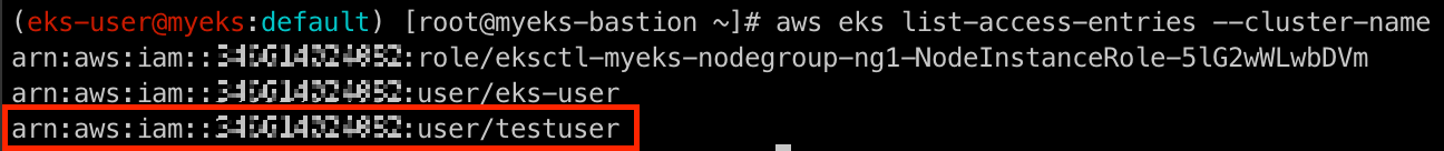 delete-access-entry 명령어를 통해 testuser를 삭제하도록 하겠습니다.
