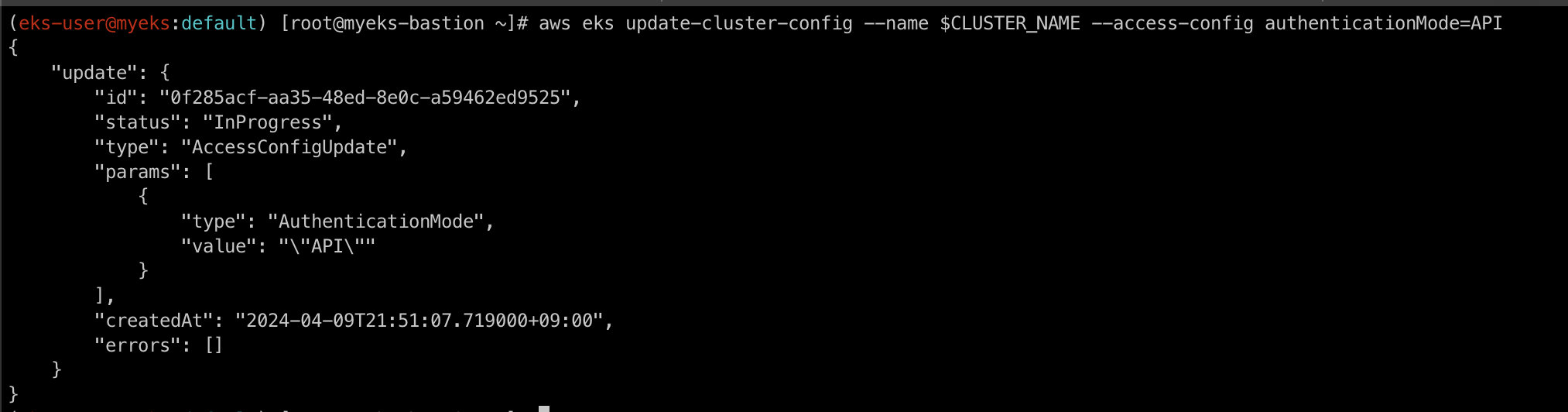 aws eks update-cluster-config --name $CLUSTER_NAME --access-config authenticationMode=API