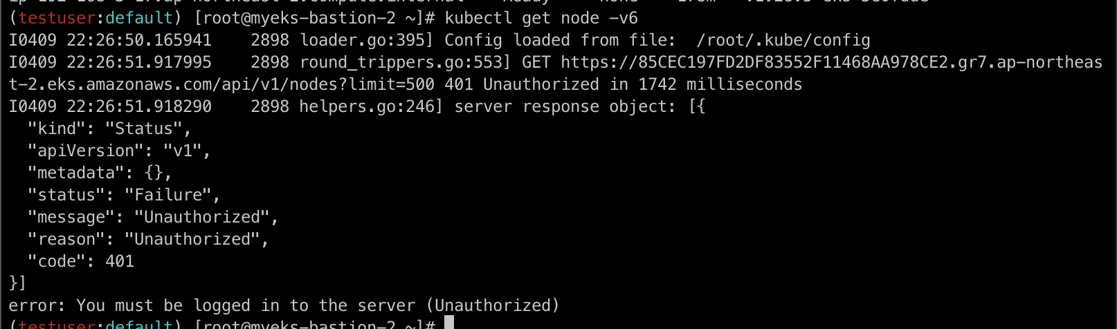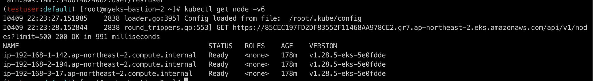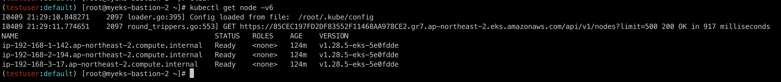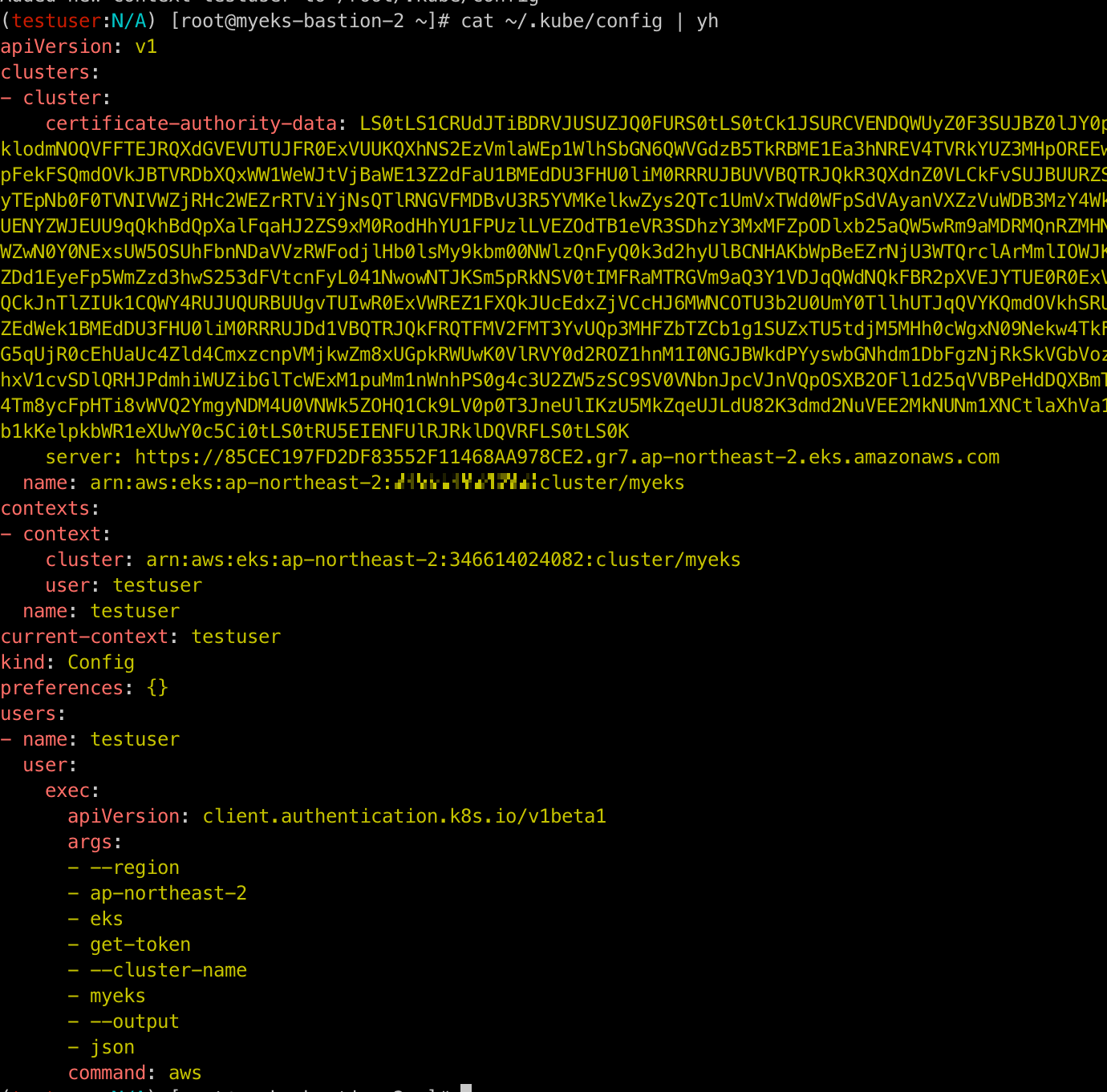 이제 다시 신규 EC2로 돌아와 아래의 명령어를 통해 testuser의 권한으로 eks에 설정되어 있는 kubeconfig 파일을 업데이트합니다.