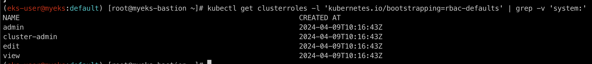 kubectl get clusterroles -l 'kubernetes.io/bootstrapping=rbac-defaults' | grep -v 'system:'