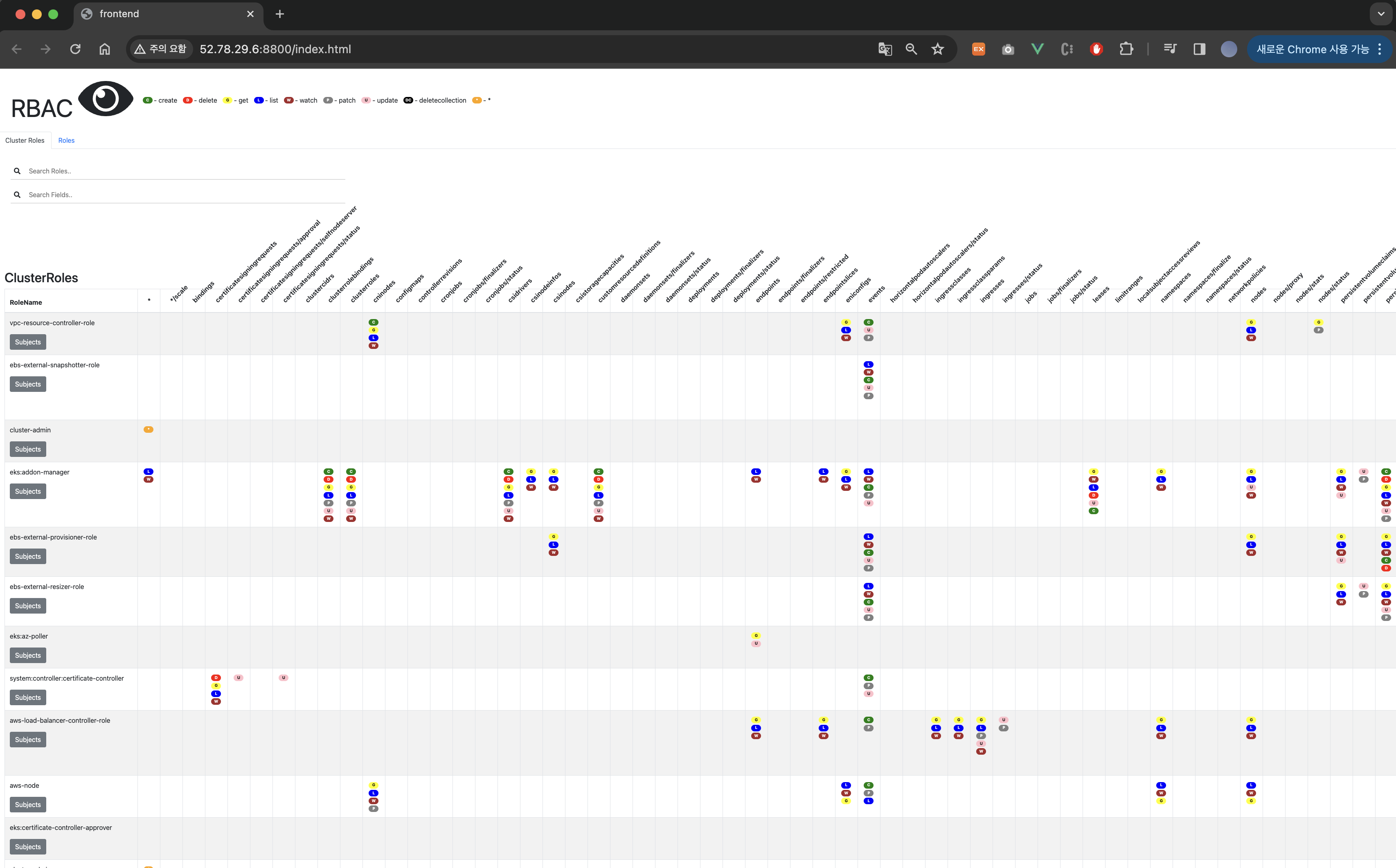 가로축이 role name을 나타내고 세로축이 세부적으로 mapping된 리소스를 나타냅니다. 또한 verb를 C(create), D(delete), G(get), L(list), W(watch), P(patch), U(update), DC(deletecollection), *의 tag 형식으로 나타냅니다.