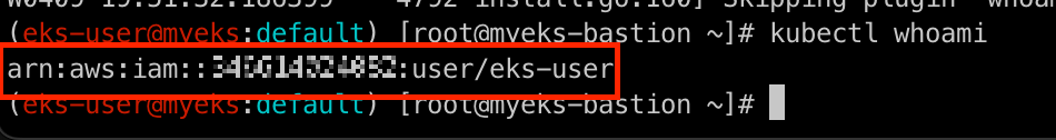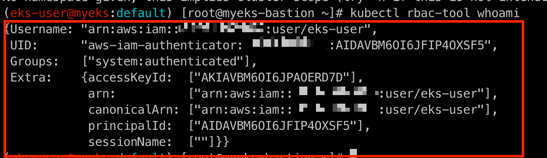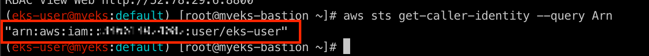 일반적인 k8s의 RBAC와의 차이점은 Username이 kubernetes-admin에서 user/eks-user로 달라진 것입니다. 또한, aws의 configmap 파일과 최근에 신규로 추가된 Access conrole 기능으로 인해서 처리되기 때문에 Group의 system:master는 보이지 않습니다.