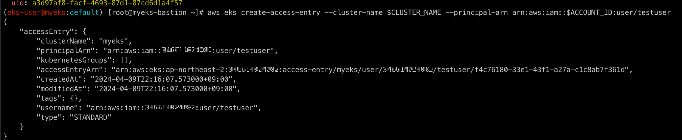 aws eks create-access-entry --cluster-name $CLUSTER_NAME --principal-arn arn:aws:iam::$ACCOUNT_ID:user/testuser
