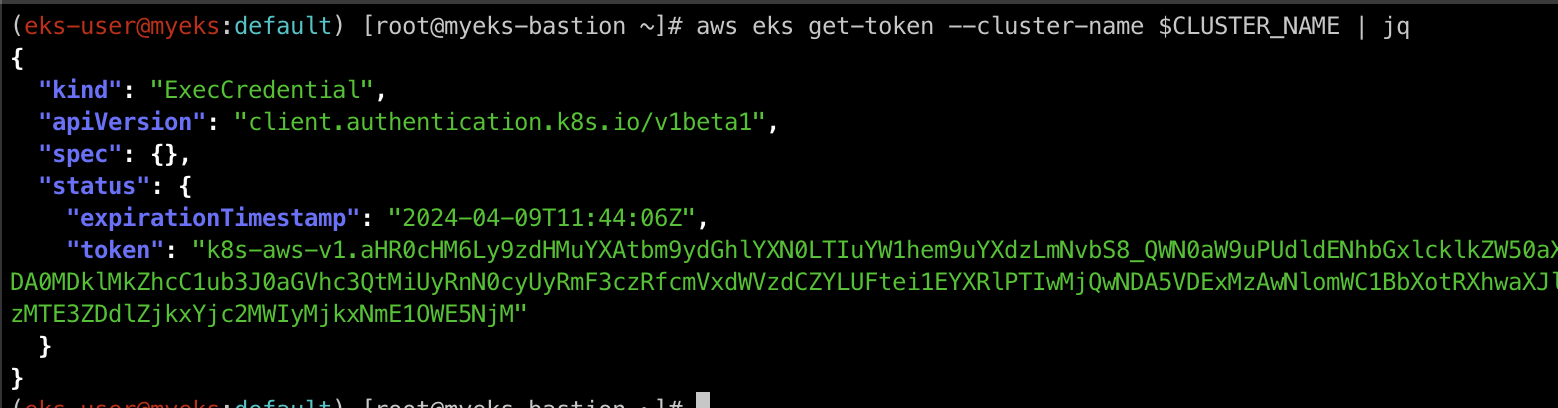 aws eks get-token 명령를 통해 현재 cluster내의 임시 보안 자격 증명을 조회할 수 있습니다.