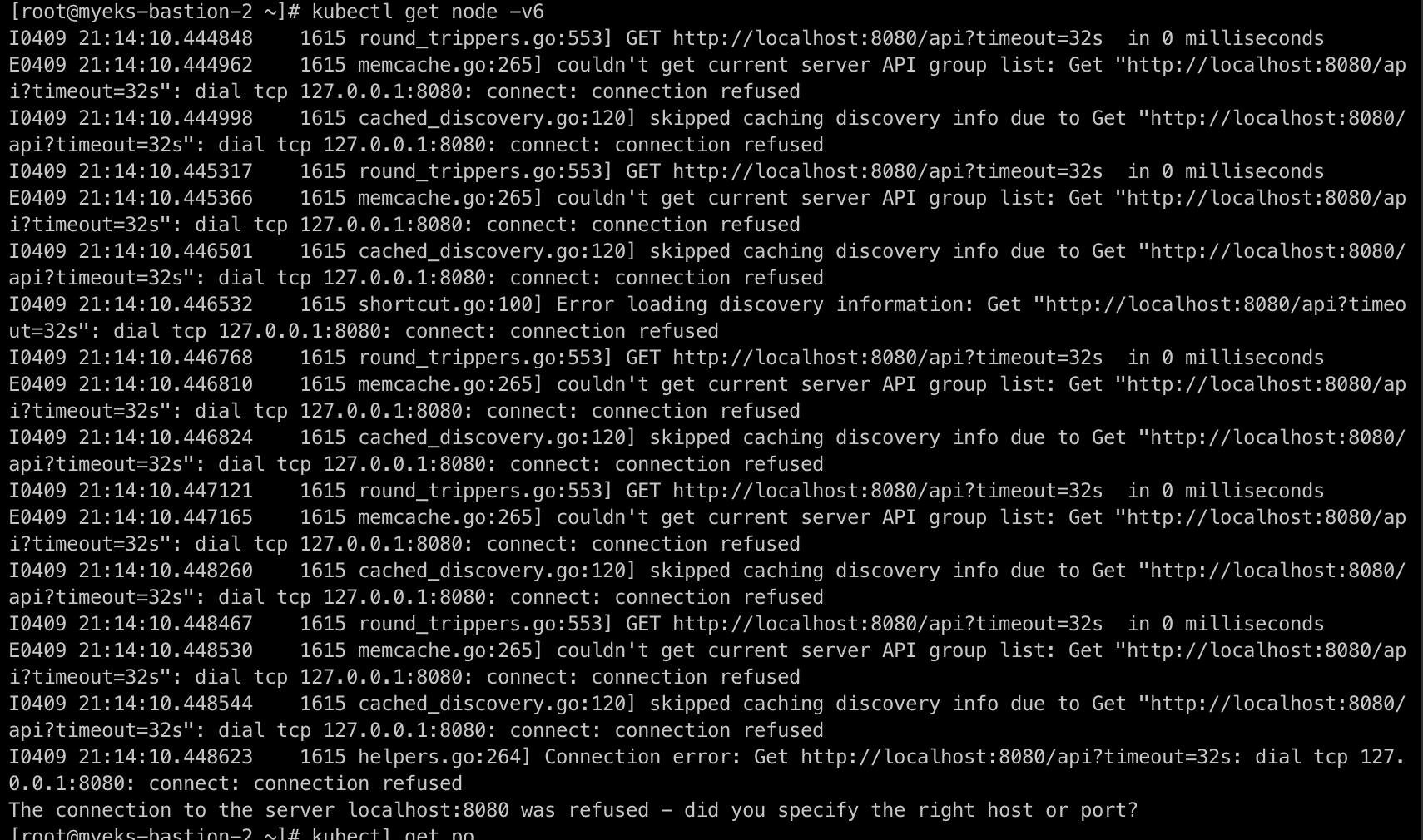 삭제한 후 kubectl 명령어를 실행하면 아래와 같이 error가 발생하는 것을 확인하실 수 있습니다.
