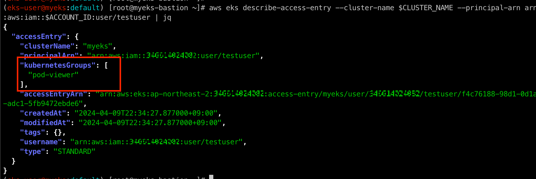 aws eks describe-access-entry --cluster-name $CLUSTER_NAME --principal-arn arn:aws:iam::$ACCOUNT_ID:user/testuser | jq