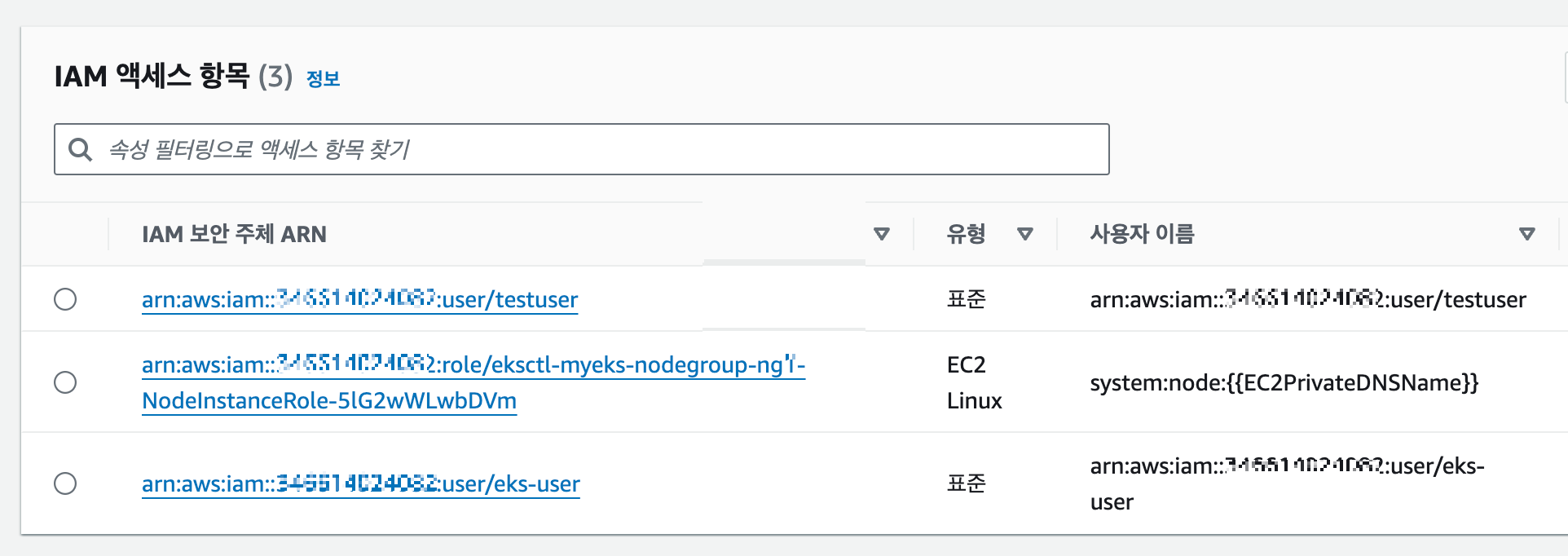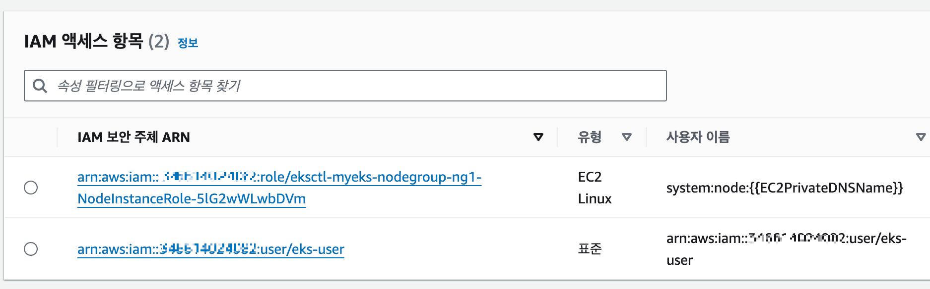 하지만 EKS를 설치한 AWS IAM의 ARN은 해당 조회에서 보이지 않습니다. (아마 여기 있었을경우 만약 실수로 삭제 시 복구가 불가능하기 때문에 생략한 듯 싶습니다.)