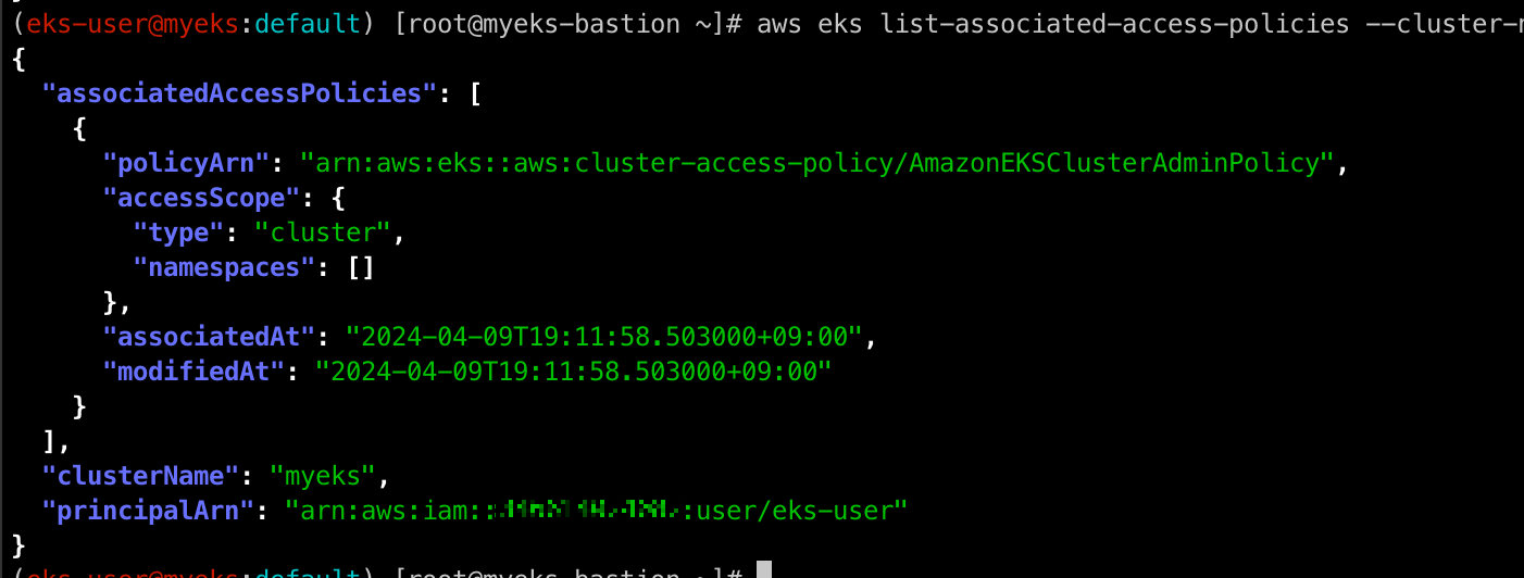 list-associated-access-policies 명령어를 통해 cluster에 있는 arn(eks-user)에 연결된 IAM Policy를 확인합니다.