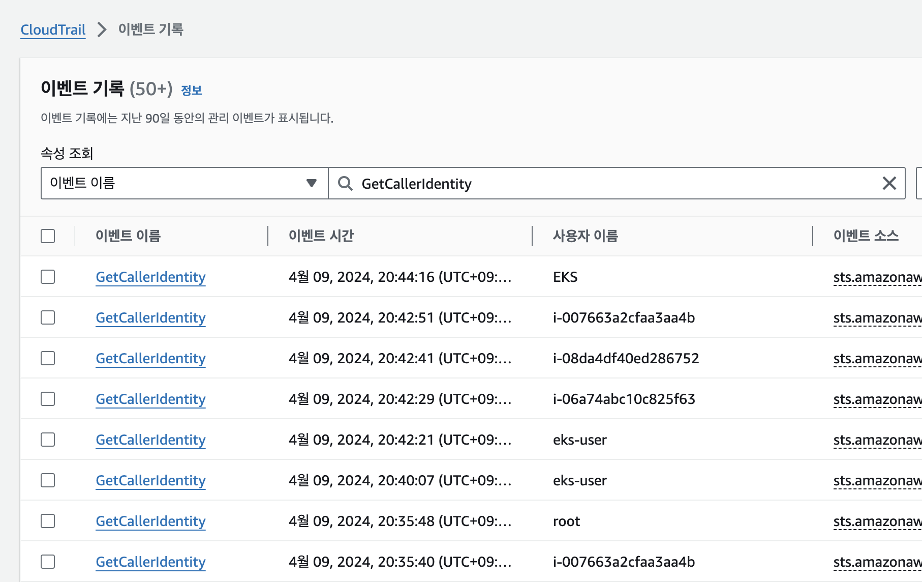 https://ap-northeast-2.console.aws.amazon.com/cloudtrailv2/home?region=ap-northeast-2#/events?EventName=GetCallerIdentity