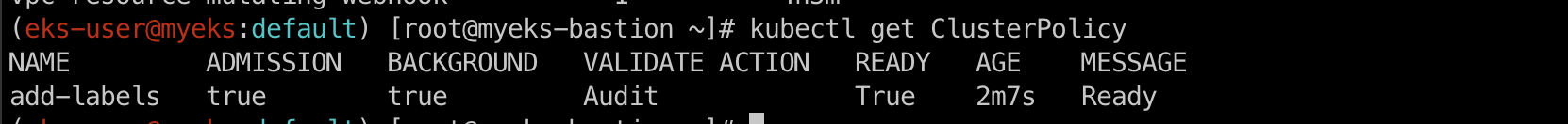 ClusterPolicy를 출력해보면 위에서 생성한 Cluster Policy 이름인 add-lables가 보여집니다.