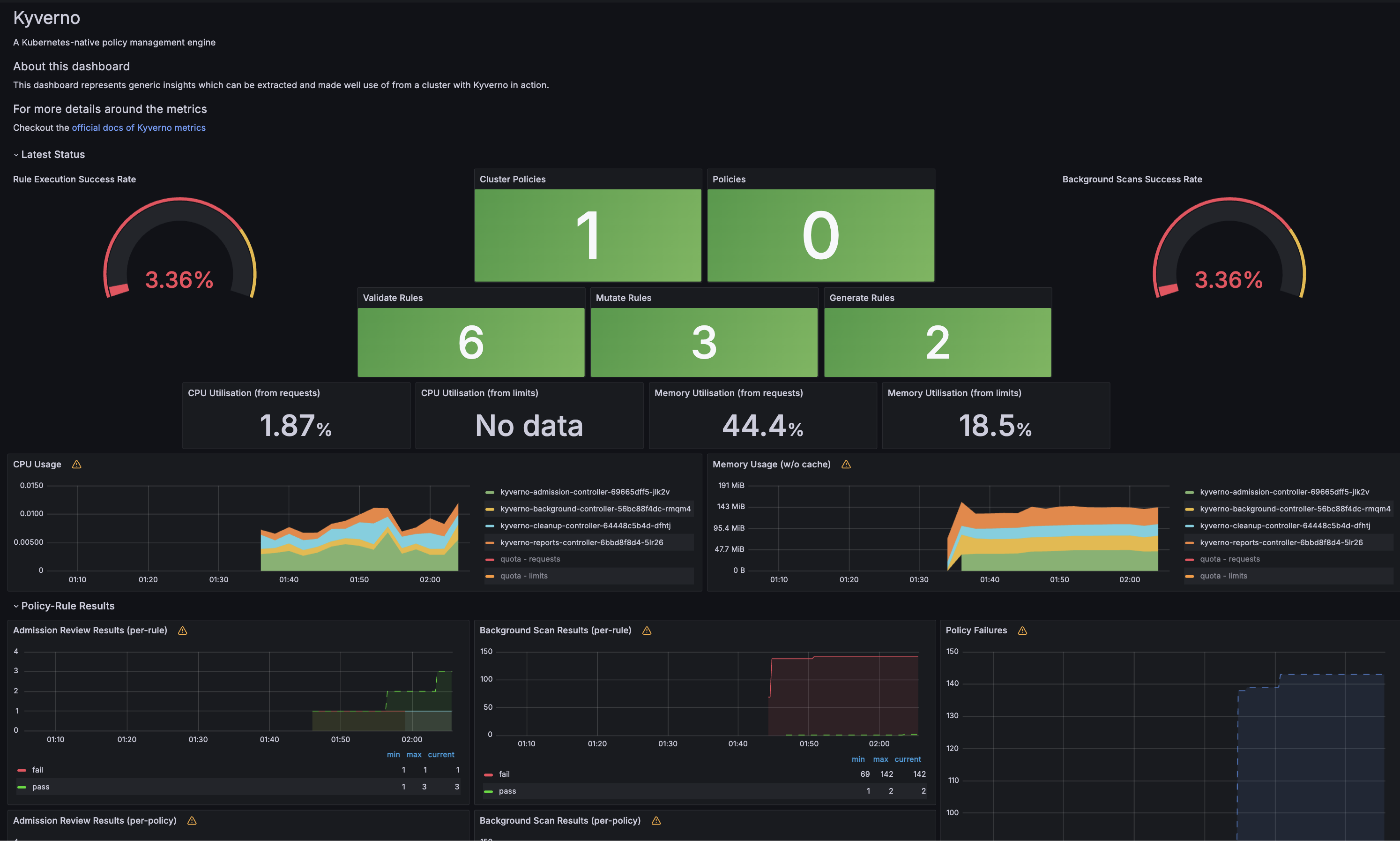 Grafana로 Kyverno를 모니터링하는 것은 Cluster 관리자와 보안 관리자에게 한눈에 인사이트를 제공할 수 있습니다. 또, Cluster의 Health Check와 보안 상태를 꾸준히 관리하는 것이 가능해집니다.