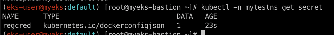 방금 생성한 namsespcae에 secret을 확인해보면 아래와 같이 regcred secret이 생성되어 있는 것을 확인하실 수 있습니다.