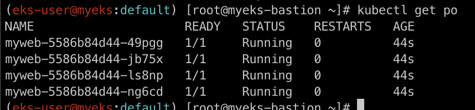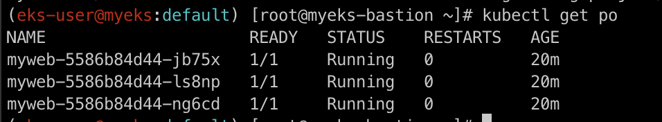 kubectl get 명령어를 통해 현재 배포된 Pod를 확인합니다.