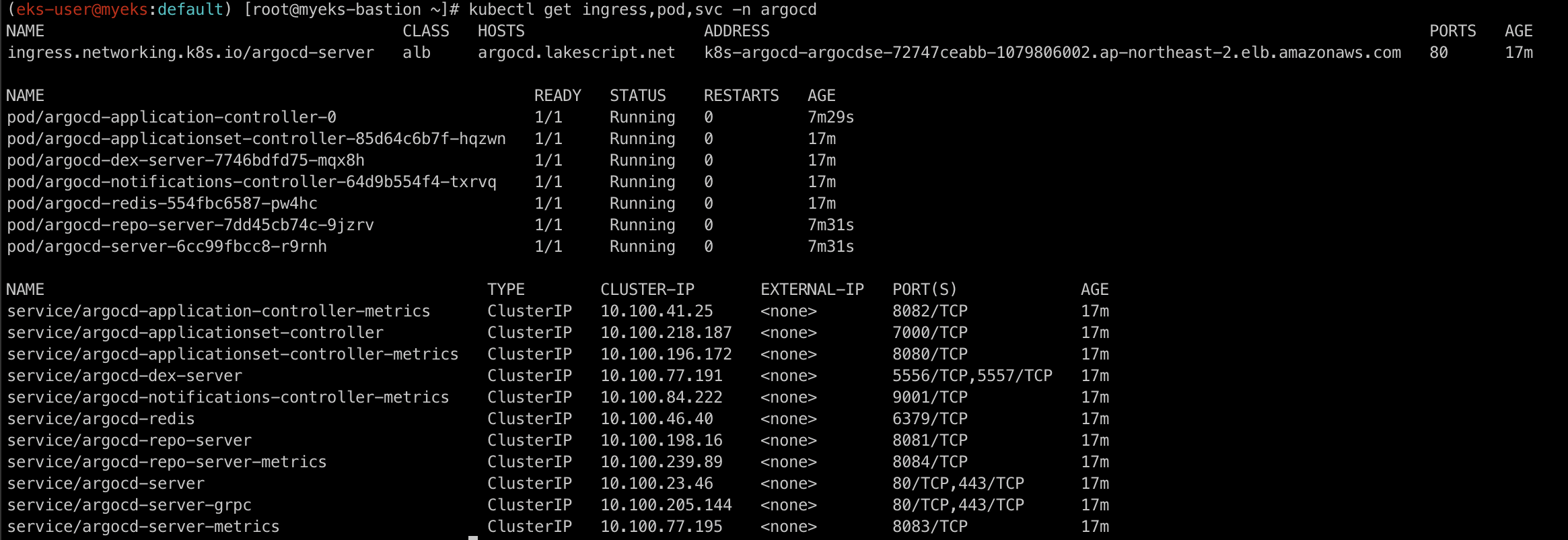 kubectl 명령을 통해 argocd namespace에 리소스가 잘 생성되었는지 확인합니다.