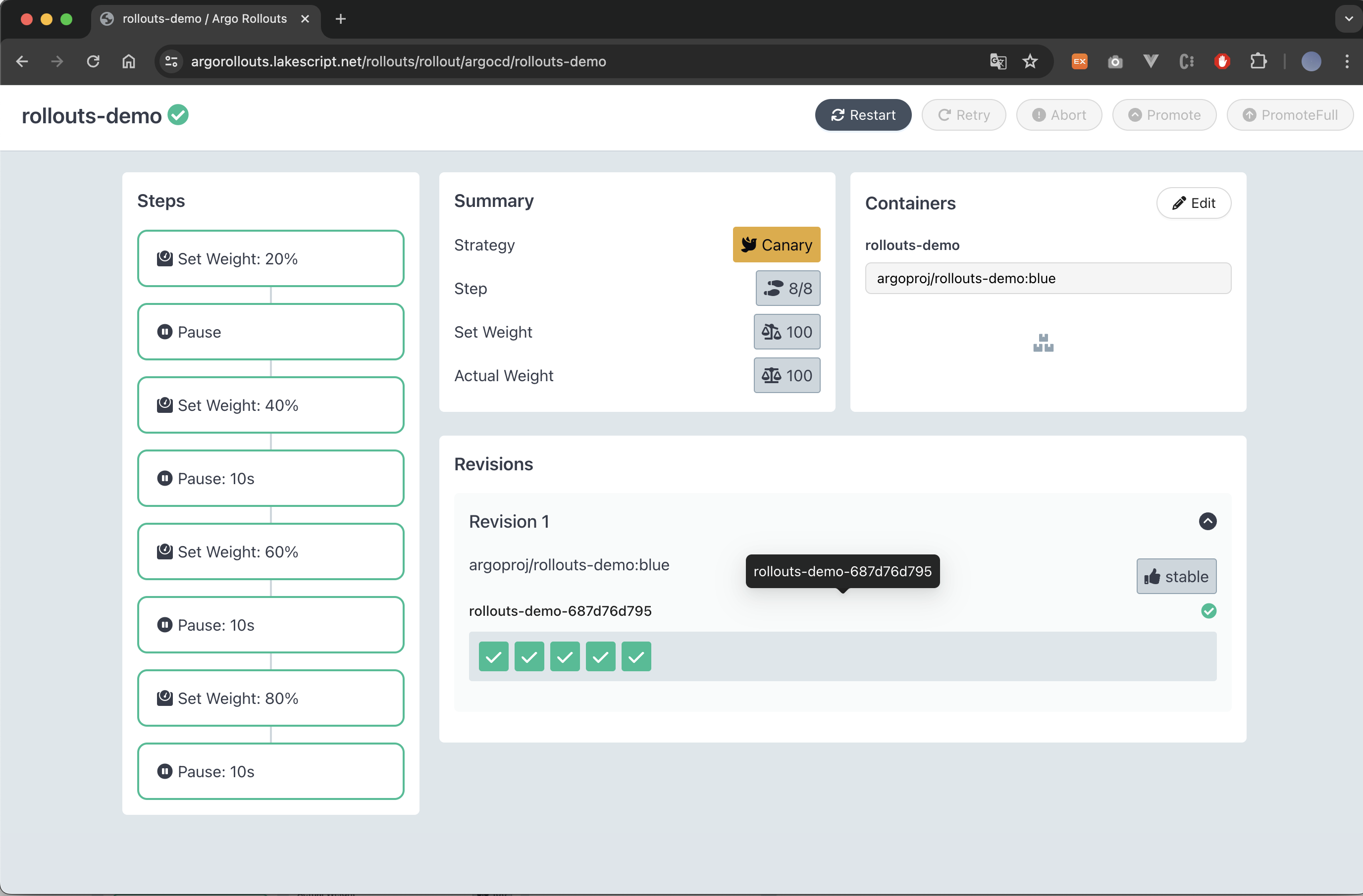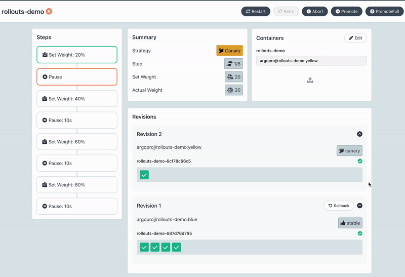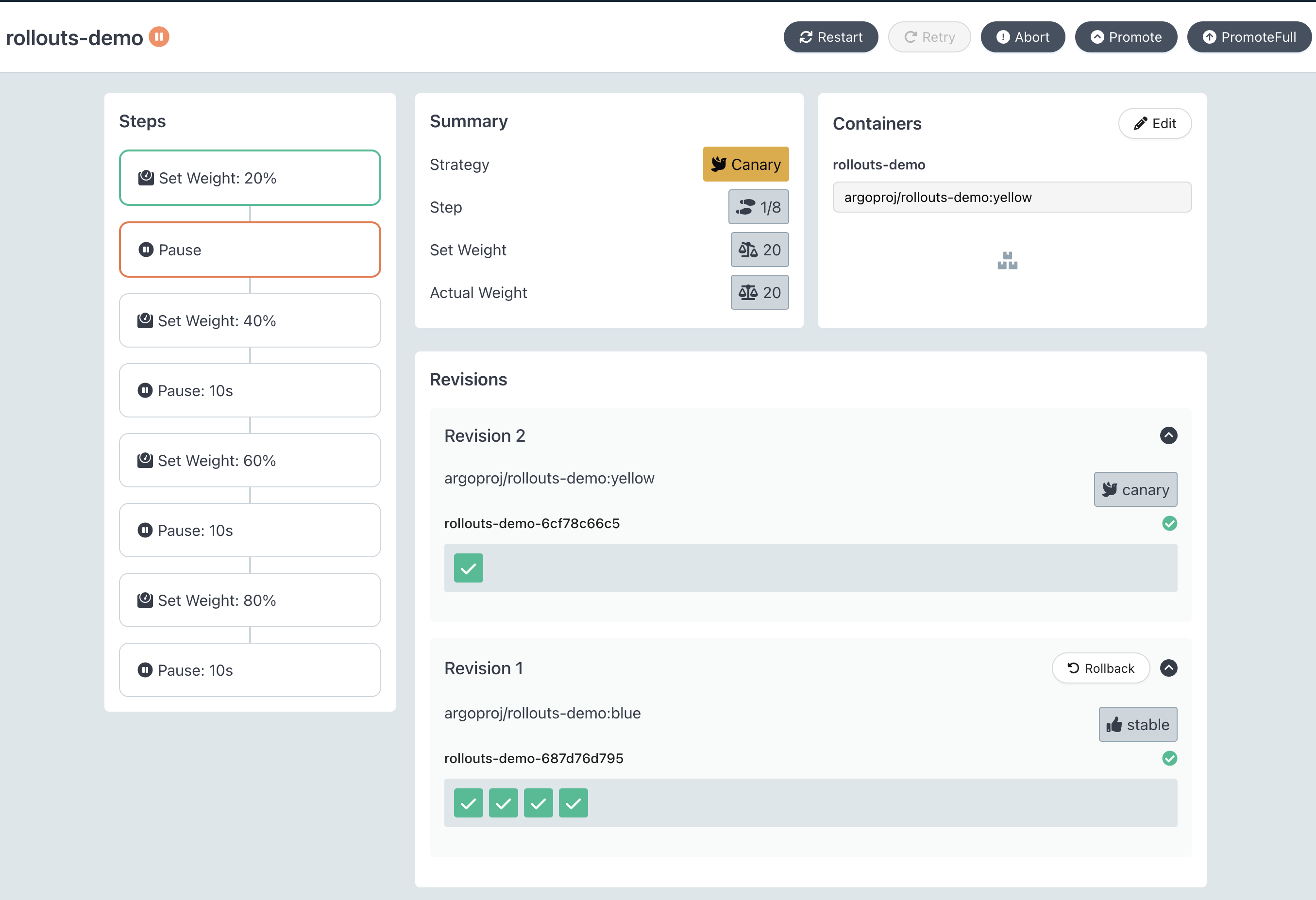 1단계를 진행 후 20%의 Pod만 변경된 후 pause 상태로 머물러있습니다. 첫번째 step에선 pause 상태의 시간을 정해두지 않아서 멈춰있게 되는데, 상단에 Promete / PromoteFull 버튼을 눌러 진행합니다.