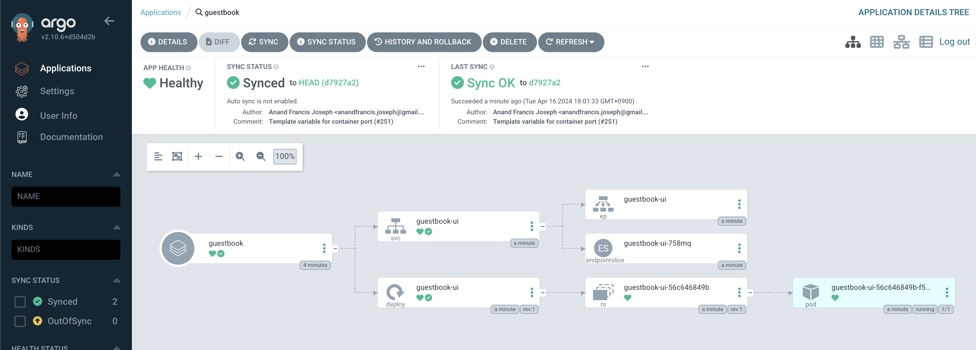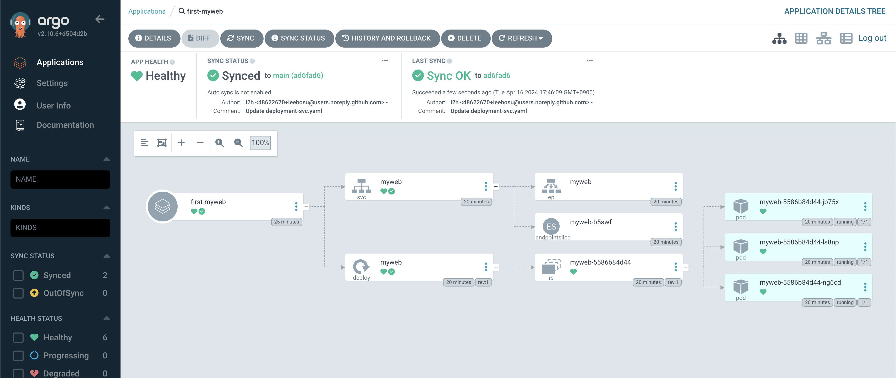ArgoCD Web에 접속하여 해당 Application을 클릭하면 위의 사진과 같이 배포가 정상적으로 진행된 것을 확인하실 수 있습니다.