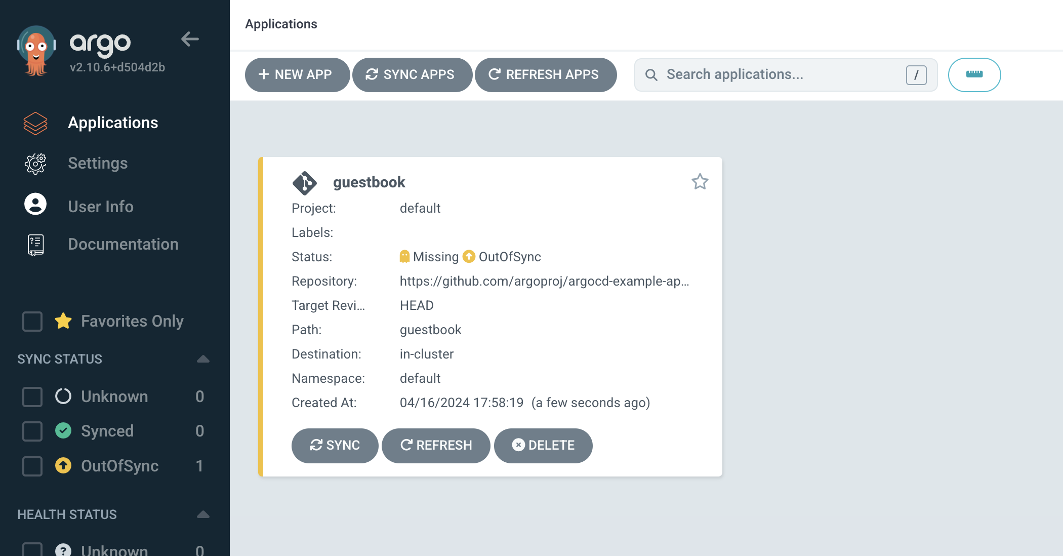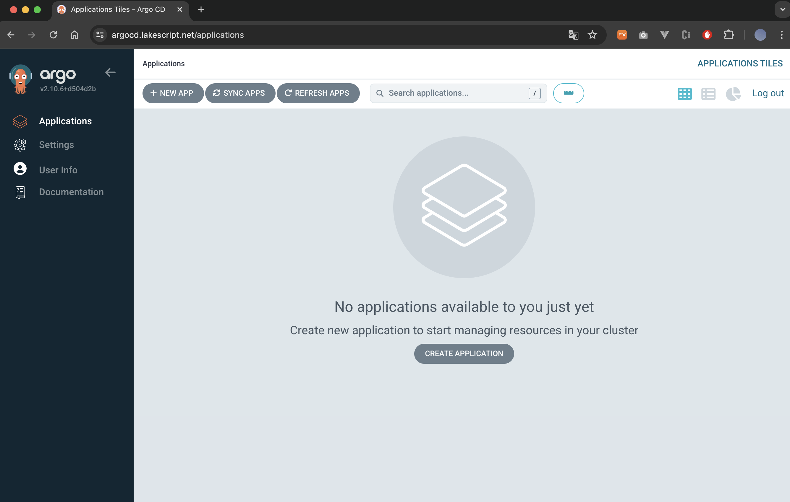 마찬가지로 ArgoCD Web에 접속하면 해당 Application이 삭제된 것을 확인하실 수 있습니다.