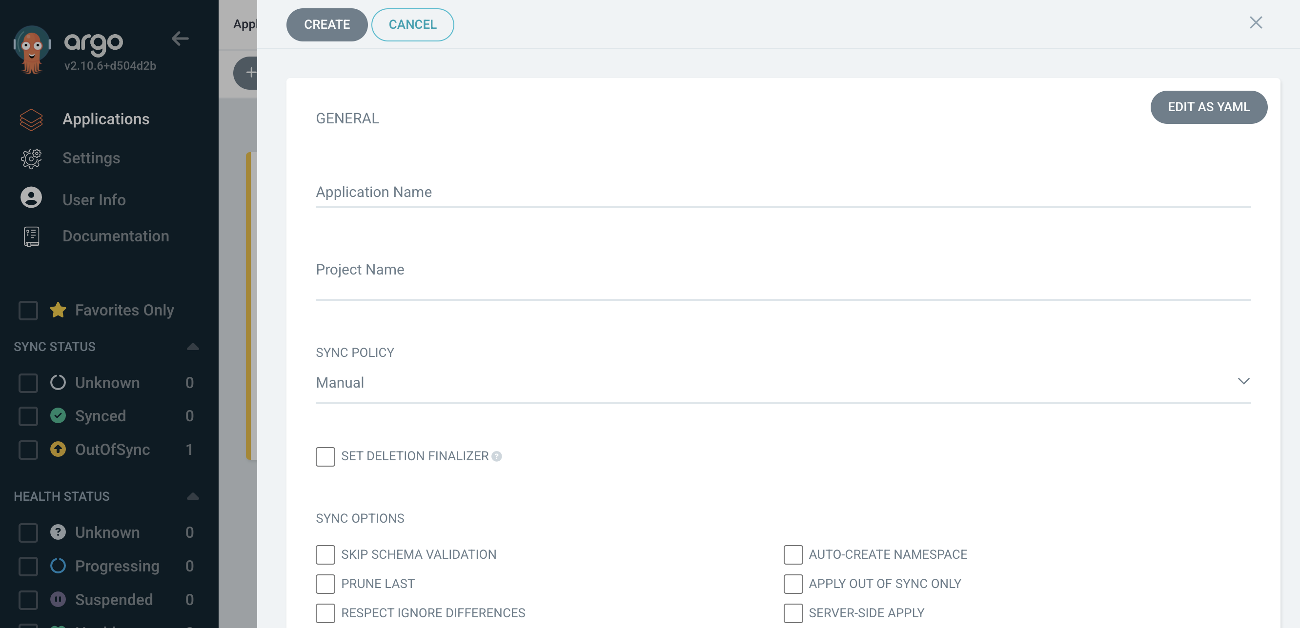 Create App 버튼을 클릭하여 ArgoCD Application을 생성합니다. 아래의 값들로 설정해주세요.