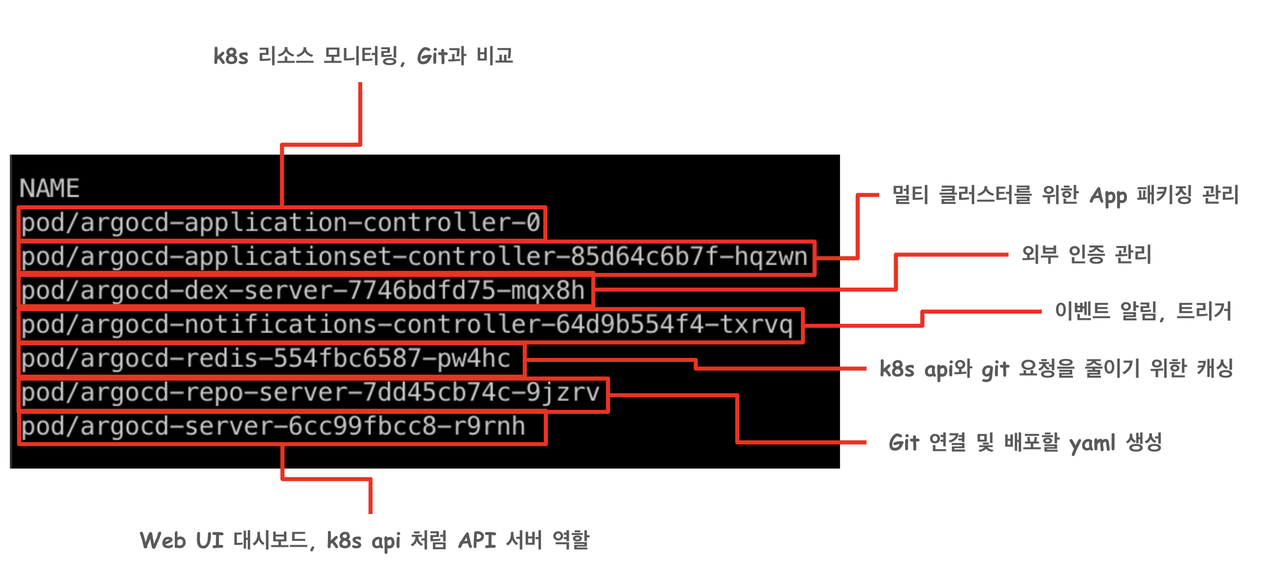기본 동작은 사용자가 git에 PR Merge를 하게 되면 ArgoCD의 RepositoryService가 이를 감지합니다. 또한, Application Controller는 k8s의 리소스를 모니터링하며 Git의 소스와 비교하여 변경점을 알려줍니다.