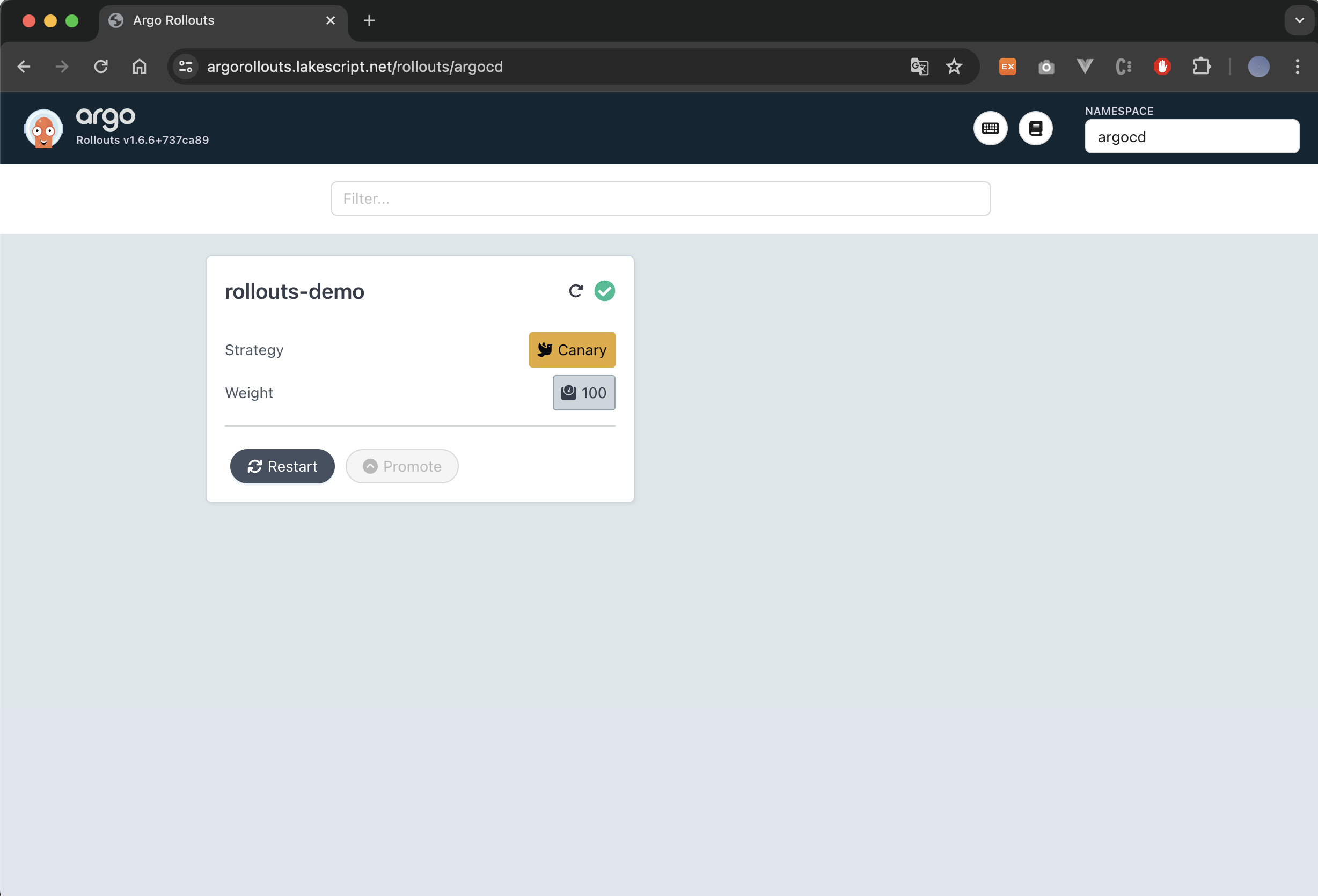 ArgoRollouts Dashboard에 접근한 후 namespace를 argocd로 변경합니다.