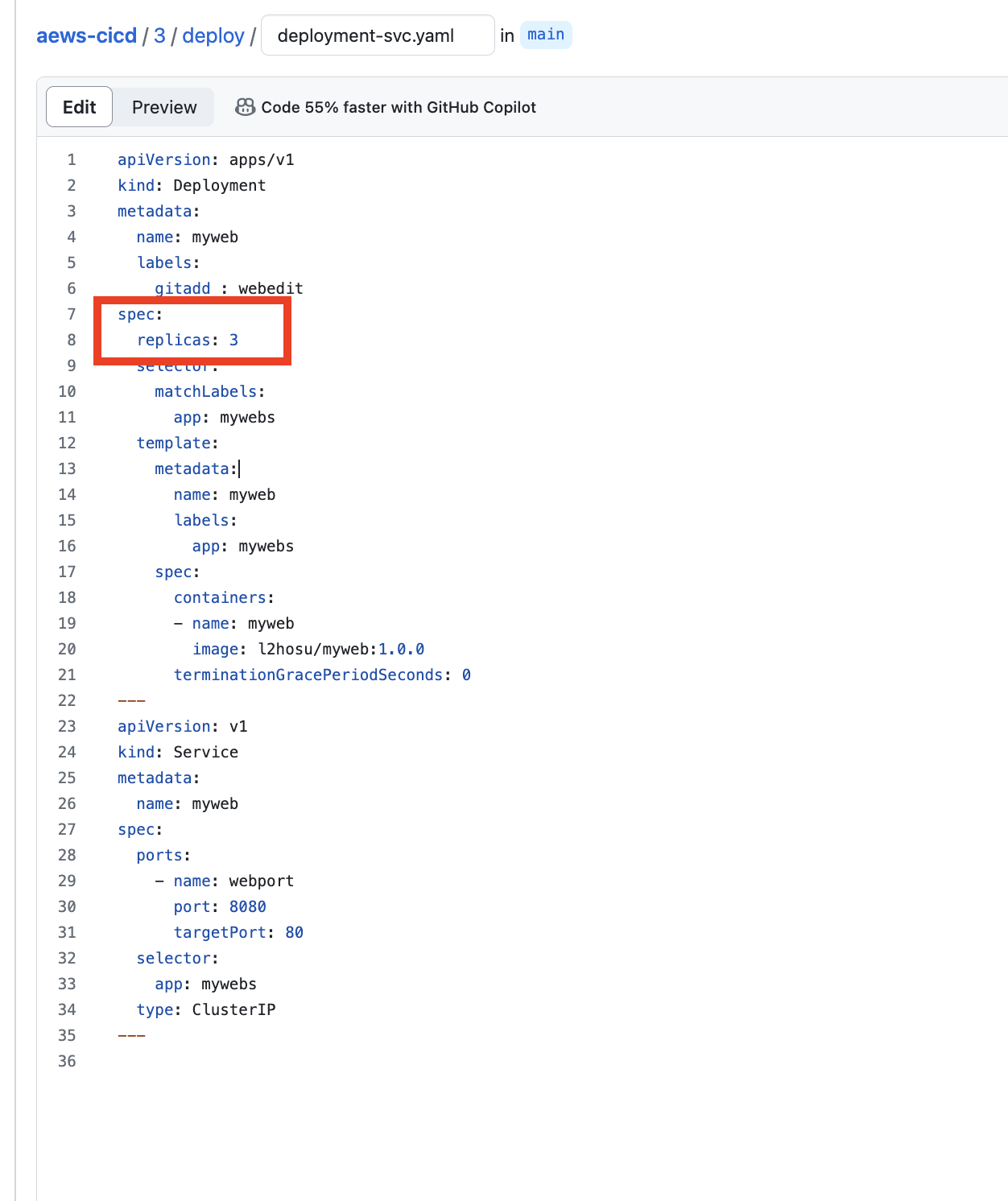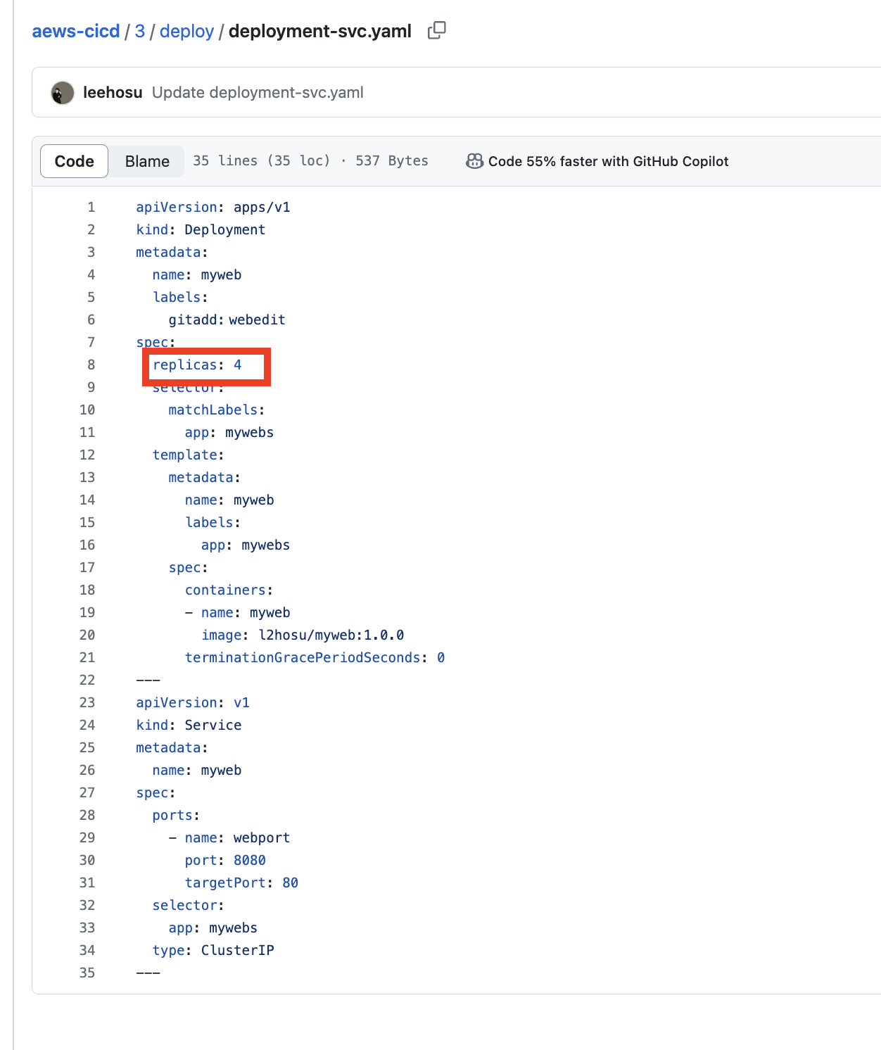 현재 aews-cicd/3/deploy/deployment-svc.yaml에서 정의된 replicas는 4개인 것을 확인하실 수 있습니다.
