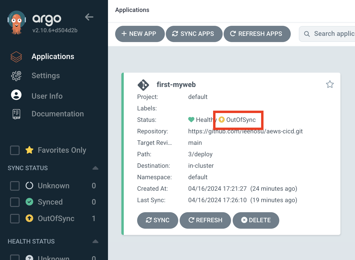 sync 명령어를 통해 Application을 배포해보겠습니다.