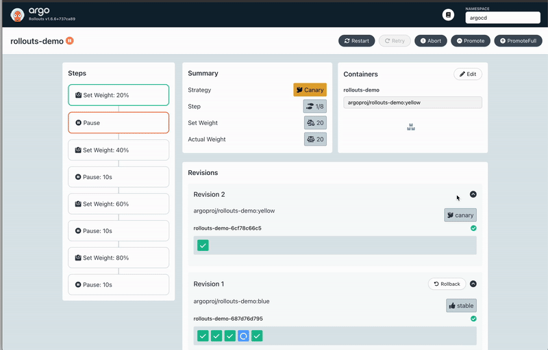1단계를 진행 후 20%의 Pod만 변경된 후 pause 상태로 머물러있습니다. 첫번째 step에선 pause 상태의 시간을 정해두지 않아서 멈춰있게 되는데, 상단에 Promete / PromoteFull 버튼을 눌러 진행합니다.