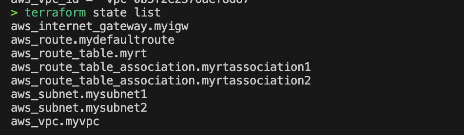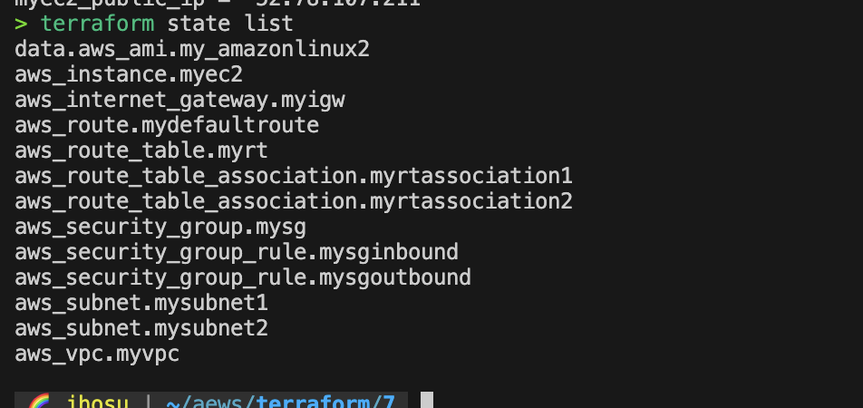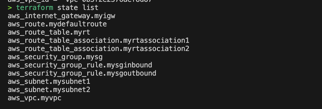 위의 명령어를 통해 terraform으로 생성한 리소스 목록을 확인합니다.