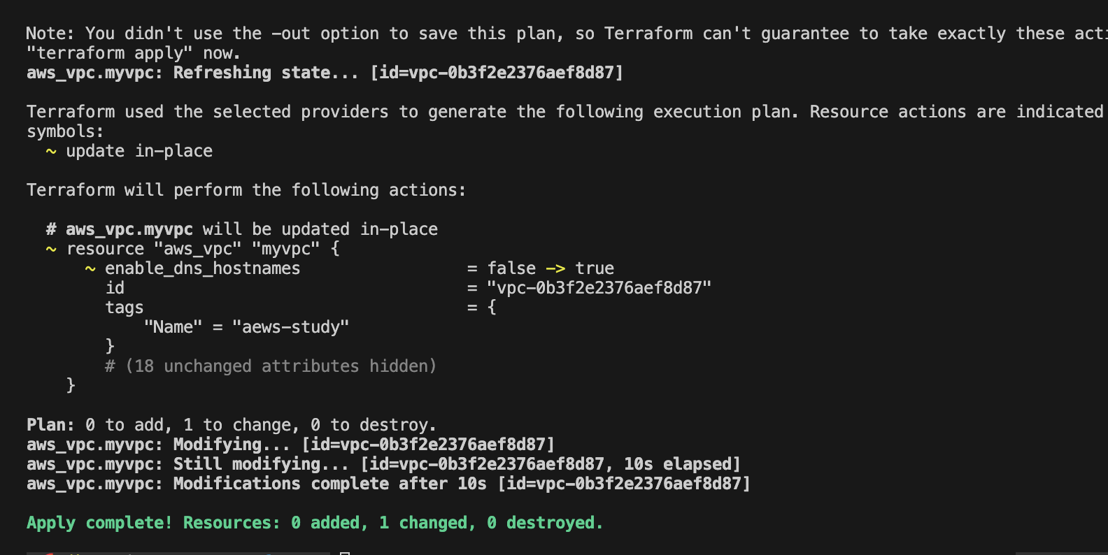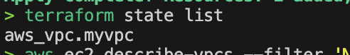 그럼 위의 사진처럼 aws_vpc.myvpc가 정상적으로 생성된 것을 확인하실 수 있습니다.
