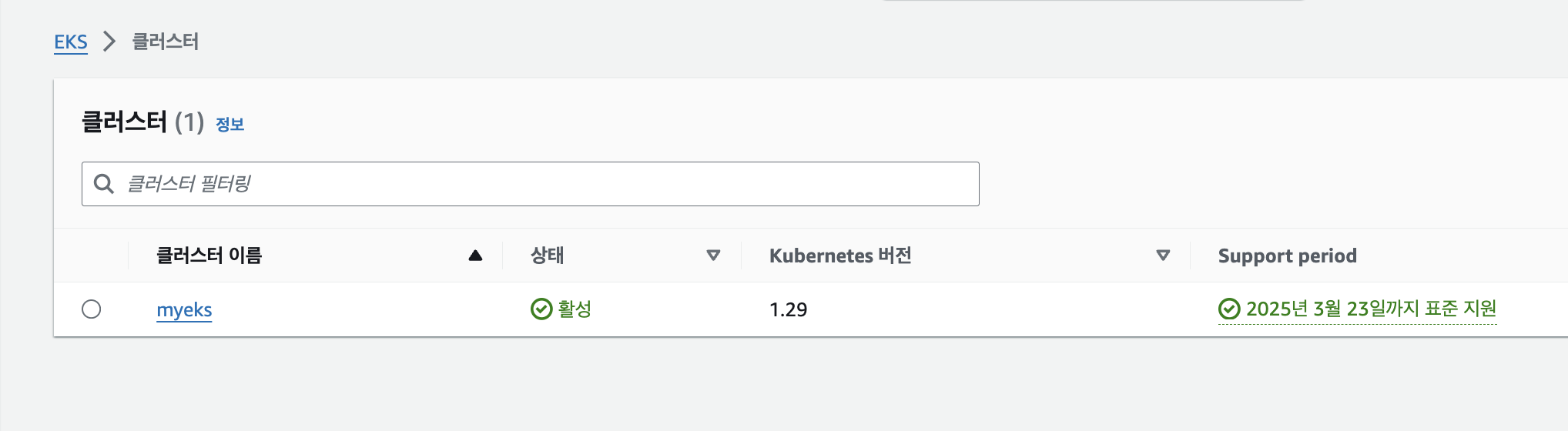AWS Managed Console에 접근하여 EKS 메뉴에서 확인해보시면 정상적으로 EKS Cluster가 생성된 것을 확인하실 수 있습니다.