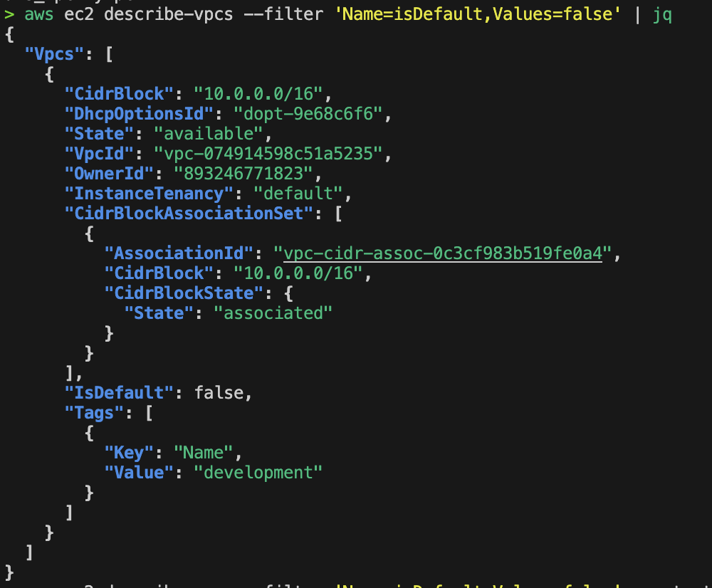 aws ec2 describe-vpcs --filter 'Name=isDefault,Values=false' | jq