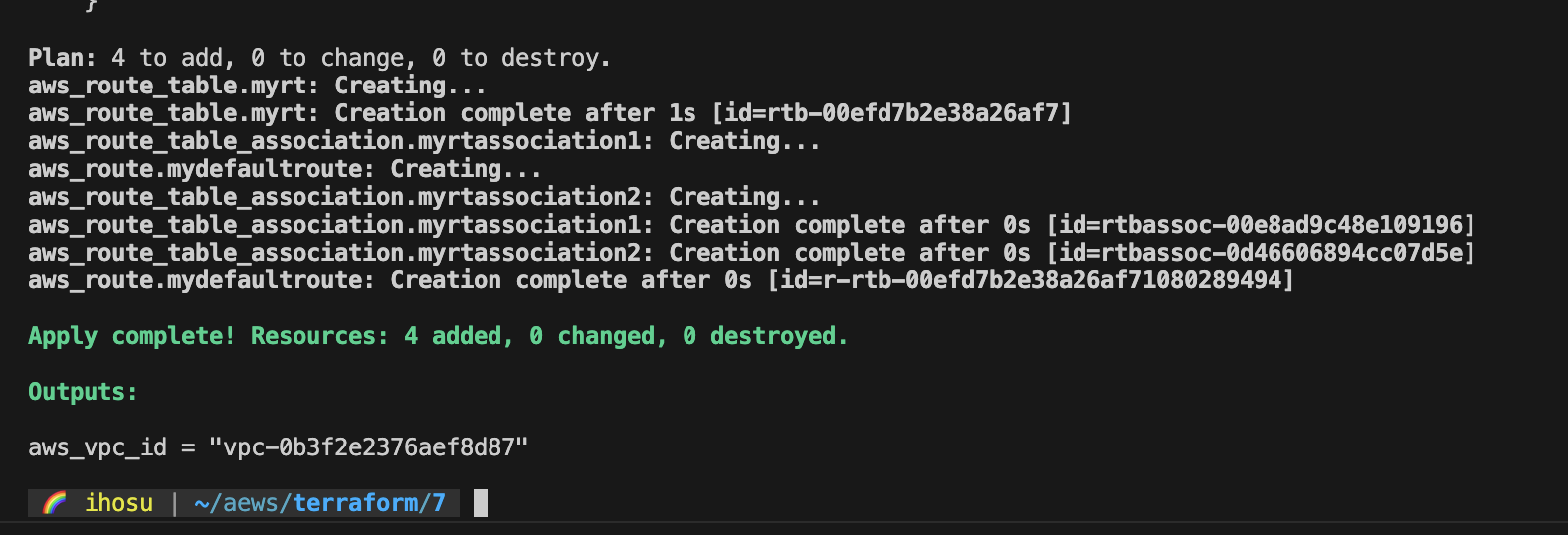 aws_route.mydefaultroute, aws_route_table.myrt aws_route_table_association.myrtassociation1, aws_route_table_association.myrtassociation2 이 생성된 것을 확인하실 수 있습니다.