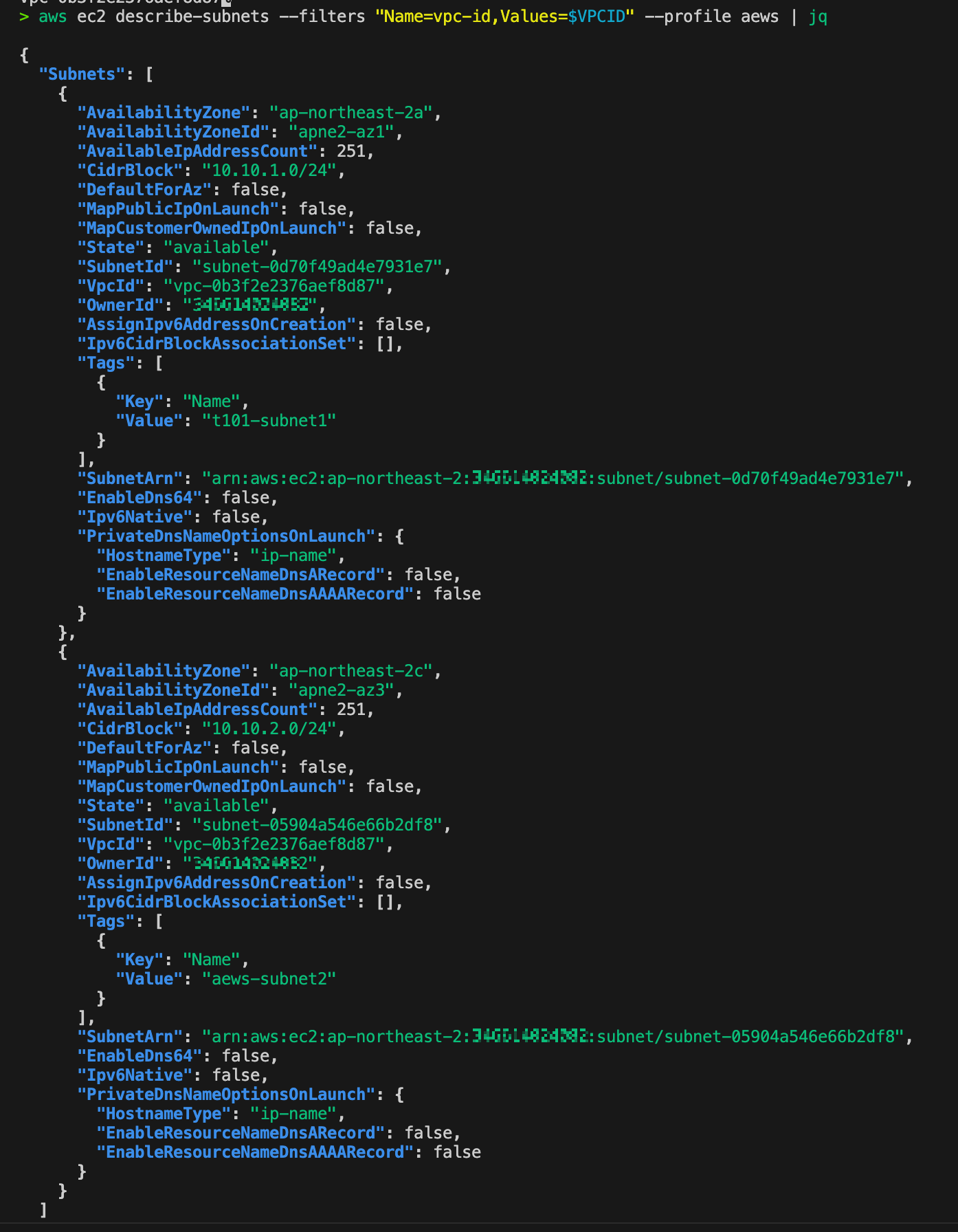 aws ec2 describe-subnets --filters "Name=vpc-id,Values=vpc-<자신의 VPC ID>"