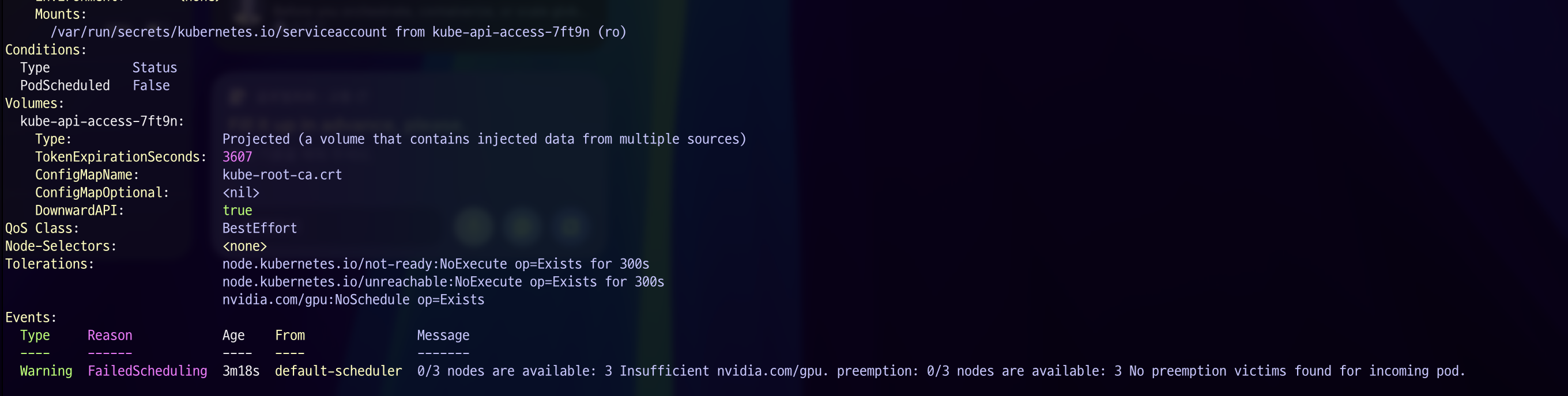 0/3 nodes are available: 3 Insufficient nvidia.com/gpu. preemption: 0/3 nodes are available: 3 No preemption victims found for incoming pod.