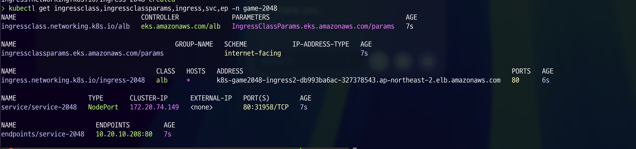 kubectl get ingressclass,ingressclassparams,ingress,svc,ep -n game-2048
