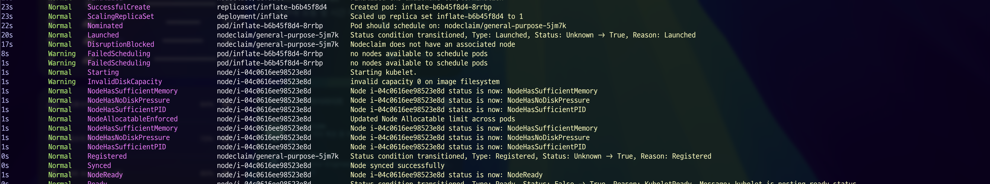 kubectl scale deployment inflate --replicas 100 && kubectl get events -w --sort-by '.lastTimestamp'