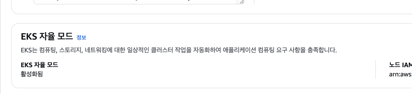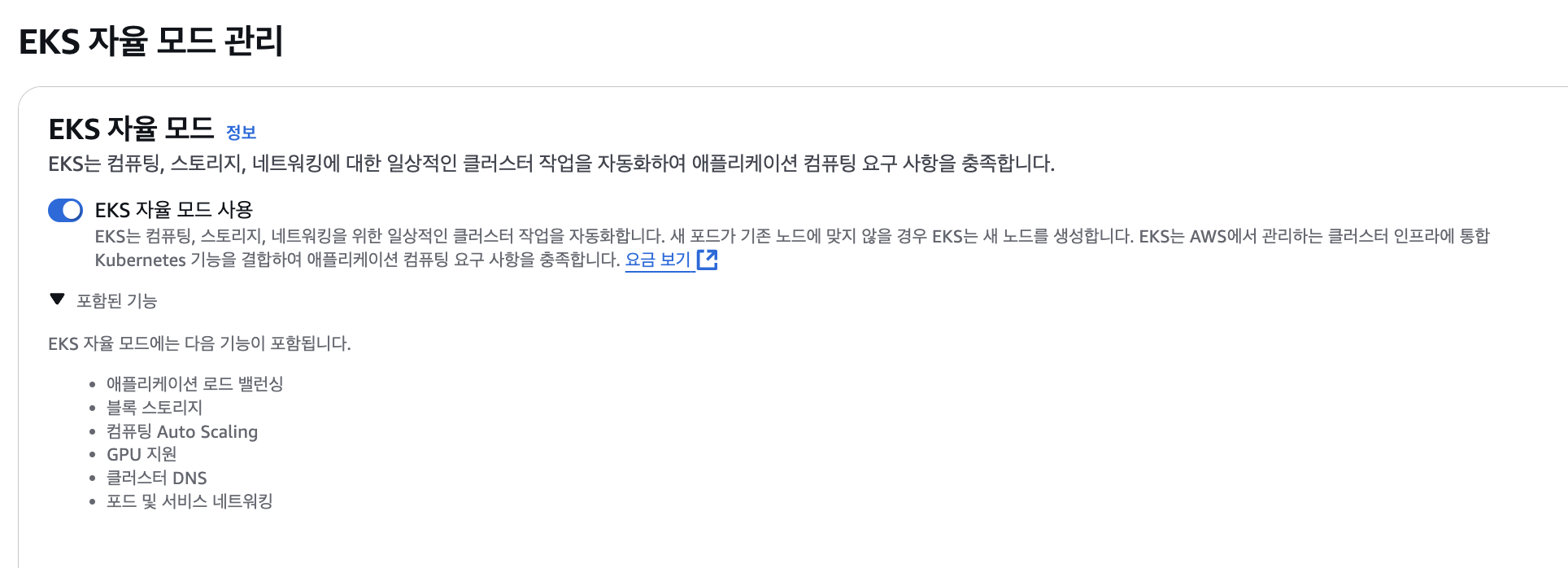 EKS 메뉴에 접근해서 해당 cluster에 접근해서 살펴보면 EKS 자율 모드가 활성화되어있는 것을 확인하실 수 있습니다.