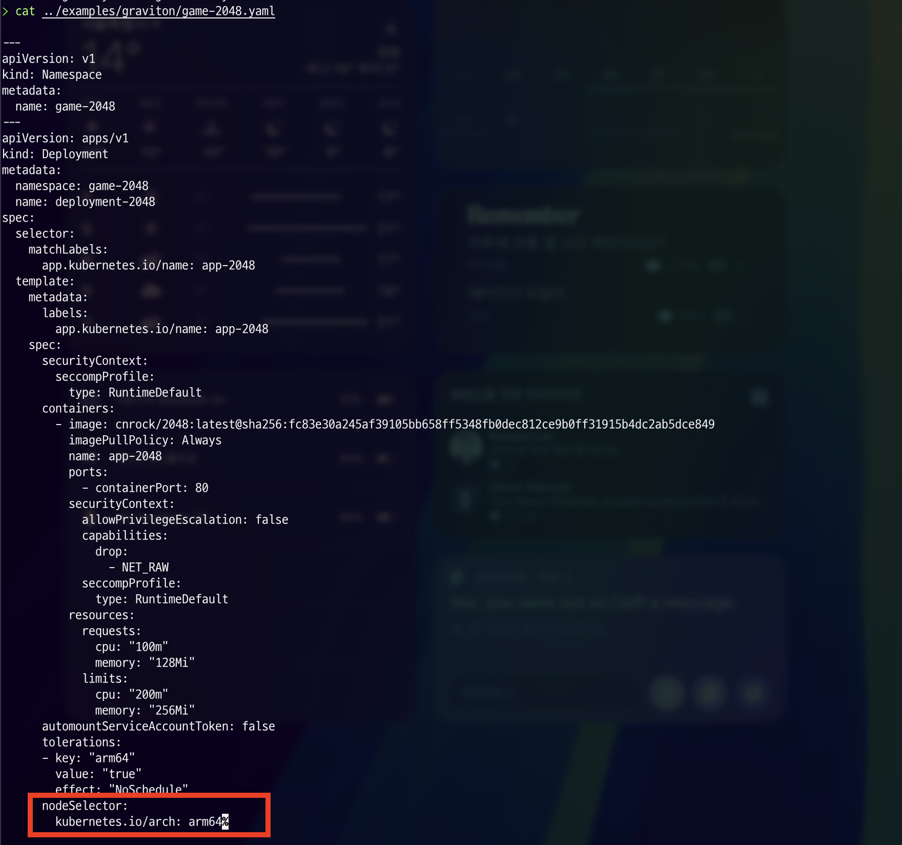 nodeselector에 arm64인 경우 배포되게 설정되어있습니다.