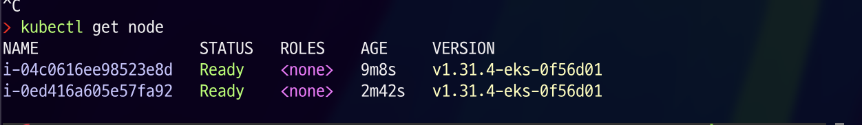 위 이벤트를 확인하고 난 후 node를 확인해보면 한개의 노드가 추가로 생성되었습니다.